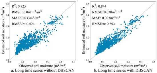 The innovation of this framework lies in its synergistic approach to handling interference from multiple surface factors. First, the core principle of the FVC segmentation correction method recognizes that the backscattering response to soil moisture exhibits nonlinear behavior with varying vegetation coverage. By employing segmented processing, we achieve accurate interpretation across different vegetation backgrounds, effectively mitigating systematic biases caused by vegetation heterogeneity, as opposed to using a single global model. Second, the introduction of the NDEVI vegetation impact correction model offers greater sensitivity to vegetation water content and biomass compared to the widely used NDVI. This enables our method to more precisely quantify and separate the volume scattering contribution from the vegetation layer, thereby reducing the dominant influence of vegetation phenological cycles on the signal. Finally, the DBSCAN anomaly detection plays a crucial role by intelligently identifying and excluding transient perturbations in surface roughness or soil moisture caused by events such as heavy rainfall, irrigation, and farming/harvesting activities, in an unsupervised manner. This process does not alter the roughness itself but ensures that the data foundation used for constructing the change detection sequence satisfies the fundamental assumption of “relatively consistent roughness” through data filtering.