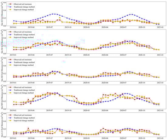 In Figure 13, Zribi’s NDVI-based change detection approach with vegetation correction was referred to as the traditional change detection method, while the enhanced methodology proposed in this study was designated as the improved change detection method; the red circular solid line was the soil moisture measured by the site, the blue triangular dotted line was the soil moisture inverted by the traditional change detection method, and the orange square dotted line was the soil moisture inverted by the improved change detection method.