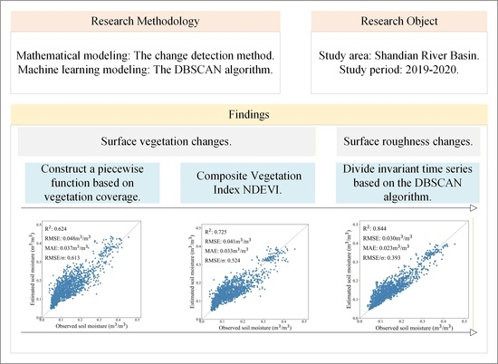 The primary objective of this study is to develop an enhanced change detection methodology for estimating time-series soil moisture. Specifically, to address the confounding interference of vegetation coverage on surface soil moisture estimation and to establish a more robust correspondence between variations in the radar backscattering coefficient and actual soil moisture dynamics, a piecewise function grounded in fractional vegetation coverage (FVC) is introduced. This function is designed to resolve the inherent mismatch problem in traditional change detection techniques, thereby augmenting the accuracy of soil moisture retrieval. Furthermore, acknowledging the limitations associated with relying on a single vegetation index (e.g., NDVI) for vegetation correction, a novel vegetation index is proposed to more comprehensively capture the influence of vegetation on radar backscattering coefficients within the study area. Concurrently, to uphold the fundamental assumption of time-invariant surface roughness that underpins change detection-based soil moisture retrieval and to mitigate spurious soil moisture variations induced by anthropogenic or natural disturbances, this study implements the Density-Based Spatial Clustering of Applications with Noise (DBSCAN) algorithm. This methodology facilitates the systematic identification of abnormal events related to dynamics in surface roughness and soil moisture across the entire time series, thus ensuring the validity of the constant-roughness prerequisite that is critical for robust soil moisture estimation. A time series characterized by stable surface roughness conditions is subsequently selected to guarantee the effectiveness and precision of the soil moisture inversion algorithm. The organization of this paper is as follows: