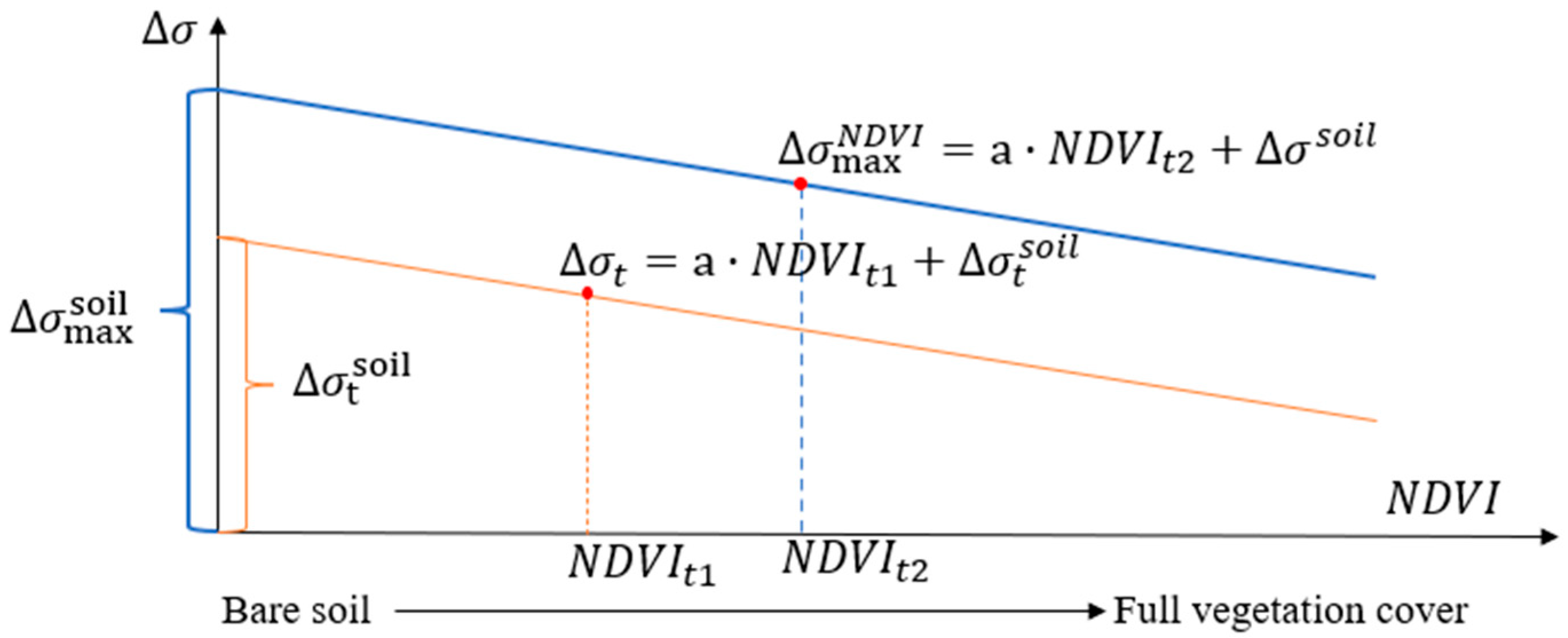 41] has become standard metrics in numerous studies for both characterizing vegetation status and accounting for vegetation-induced modifications to soil surface backscattering signals. The statistical model based on NDVI remote sensing vegetation index uses clear parameterized expressions to associate a limited number of spectral bands with surface vegetation cover [