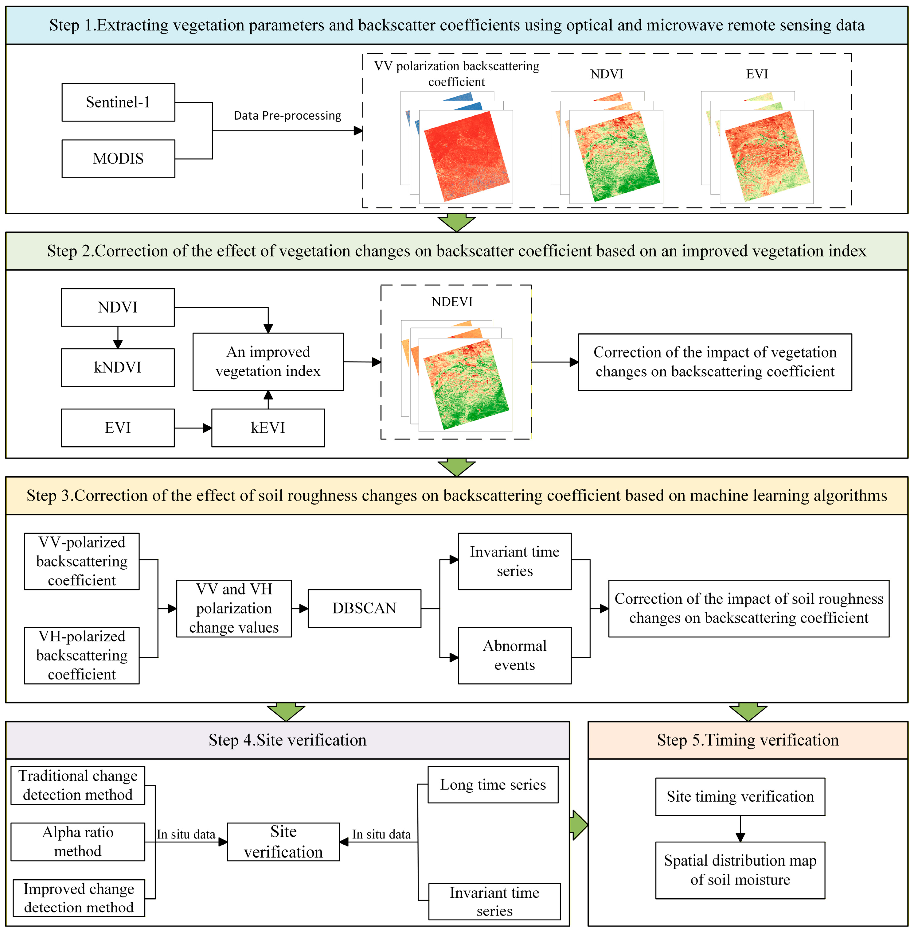 24] incorporated Normalized Difference Vegetation Index (NDVI) to correct variations in radar backscattering coefficients, thereby improving the method’s applicability to vegetation-covered surfaces, provided a new direction for subsequent research. Bhogapurapu et al. [