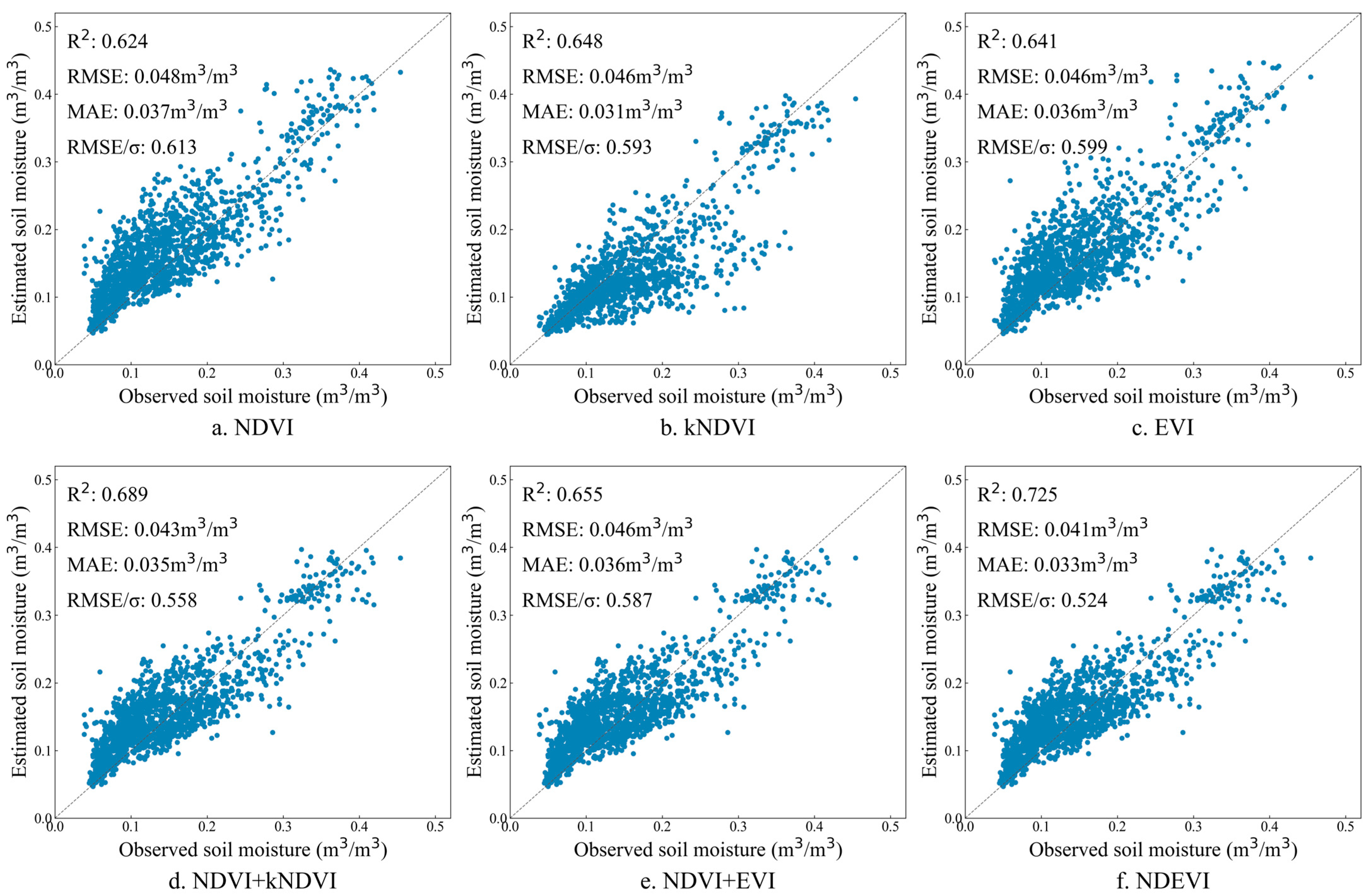 Figure 6, the soil moisture content in the Shandian river basin primarily ranges between 5% and 45%, exhibiting significant seasonal variation throughout the year. Following vegetation correction, soil moisture retrieval using the single indices NDVI and EVI yielded comparable results, with EVI demonstrating marginally superior performance to NDVI. However, both indices exhibited a consistent tendency toward slight overestimation. In contrast, the kNDVI approach—which accounts for nonlinear relationships between vegetation indices and surface vegetation characteristics—effectively mitigated the overestimation issue observed with NDVI and EVI. Nevertheless, kNDVI introduced a new systematic bias characterized by pronounced underestimation, while achieving overall accuracy levels similar to those of NDVI and EVI. The implementation of composite vegetation indices—specifically NDVI + kNDVI, NDVI + EVI, and the proposed NDEVI—yielded measurable improvements in estimation accuracy. While the NDVI + EVI combination offered only marginal enhancement over its individual components and failed to resolve the fundamental limitations associated with either index alone, the NDVI + kNDVI configuration demonstrated more substantial progress. This improvement underscored the value of incorporating nonlinear relationships between surface vegetation and index responses for enhanced vegetation correction. However, this approach remained constrained by NDVI’s inherent limitations, particularly its saturation characteristics in dense vegetation conditions. The composite vegetation index NDEVI proposed in this study, developed to address the limitations of single indices and to better represent the nonlinear relationships between surface vegetation and spectral responses, demonstrated the most substantial improvement in estimation accuracy. Comparative analysis of all six vegetation indices reveals that NDEVI achieved superior performance metrics: when compared to traditional NDVI-based vegetation correction, the determination coefficient R