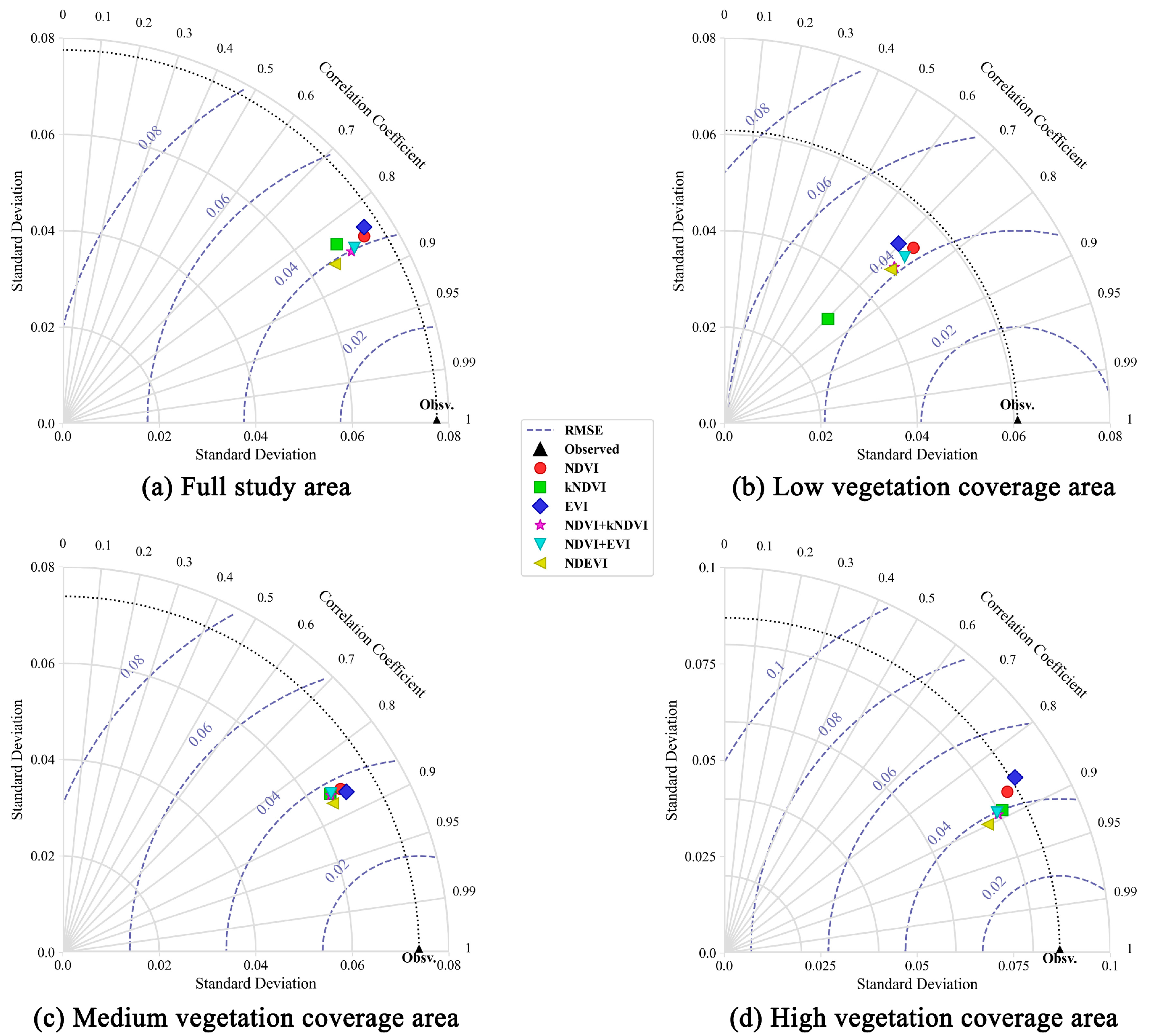 Taylor diagrams were generated for six vegetation indices across different vegetation coverage levels (