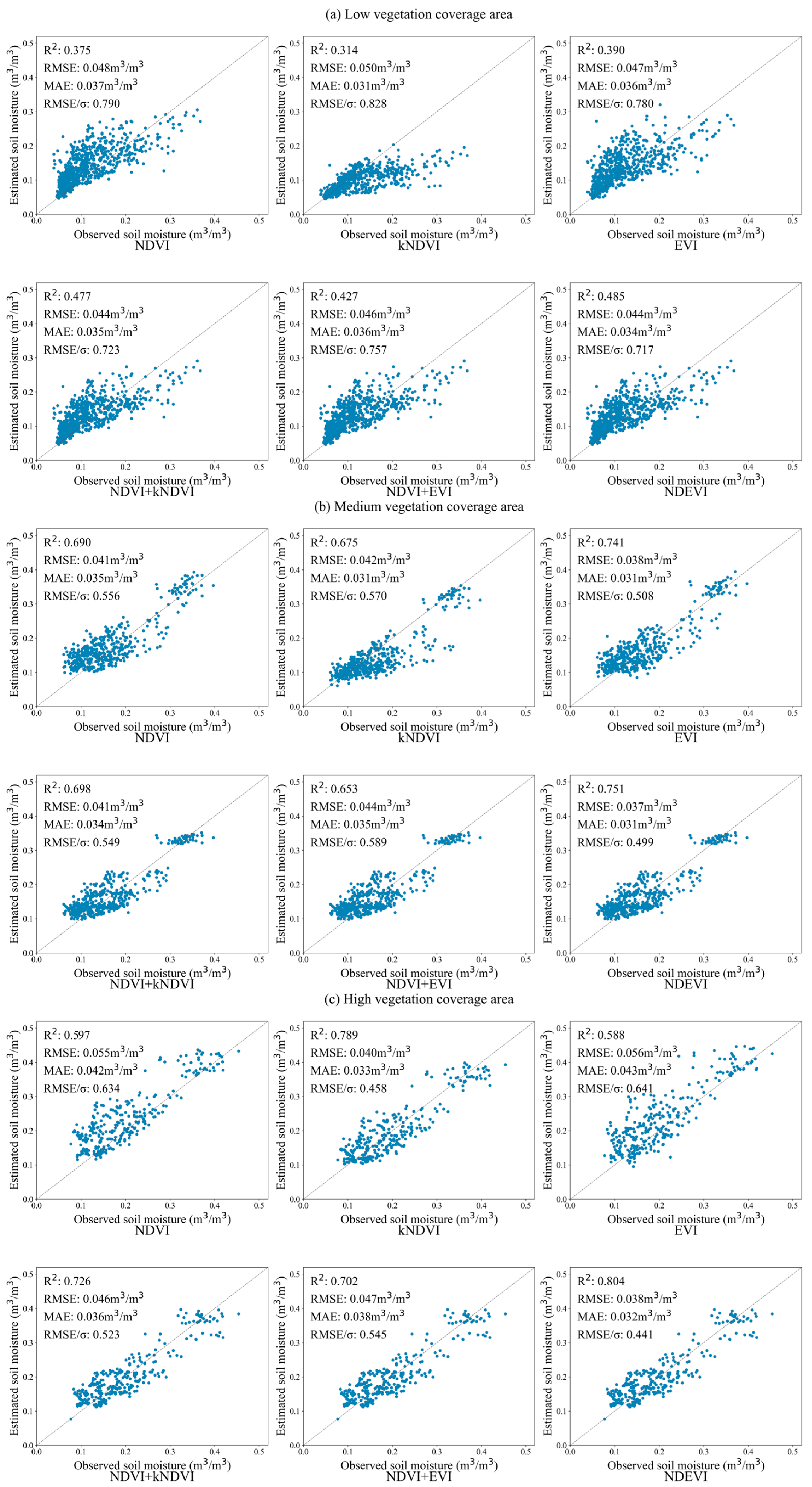 Figure 8, among the single vegetation indices, both NDVI and EVI demonstrate relatively better accuracy for soil moisture estimation in medium vegetation coverage areas, with EVI showing clearly superior performance compared to both NDVI and kNDVI in these conditions; NDVI and EVI’s performance degraded significantly in high vegetation coverage conditions due to the well-documented saturation effect in dense vegetation canopies [