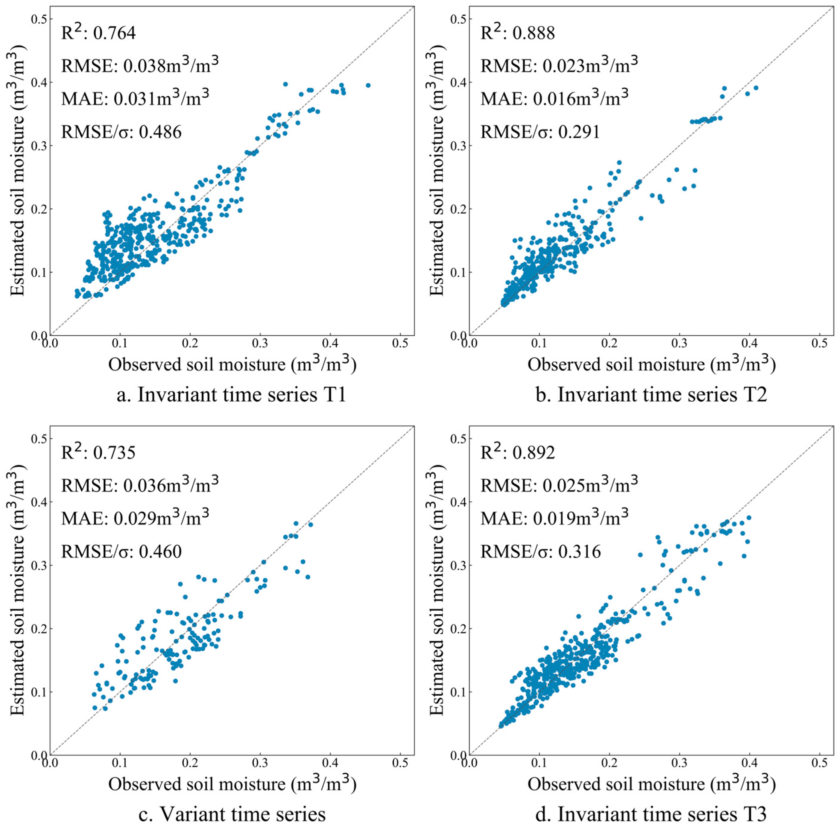 Figure 10. Compared with the long time series without eliminating abnormal events, the inversion of soil moisture based on three invariant time series and one variant time series achieved better results. Among them, the result of soil moisture inversion based on variant time series was the worst—R