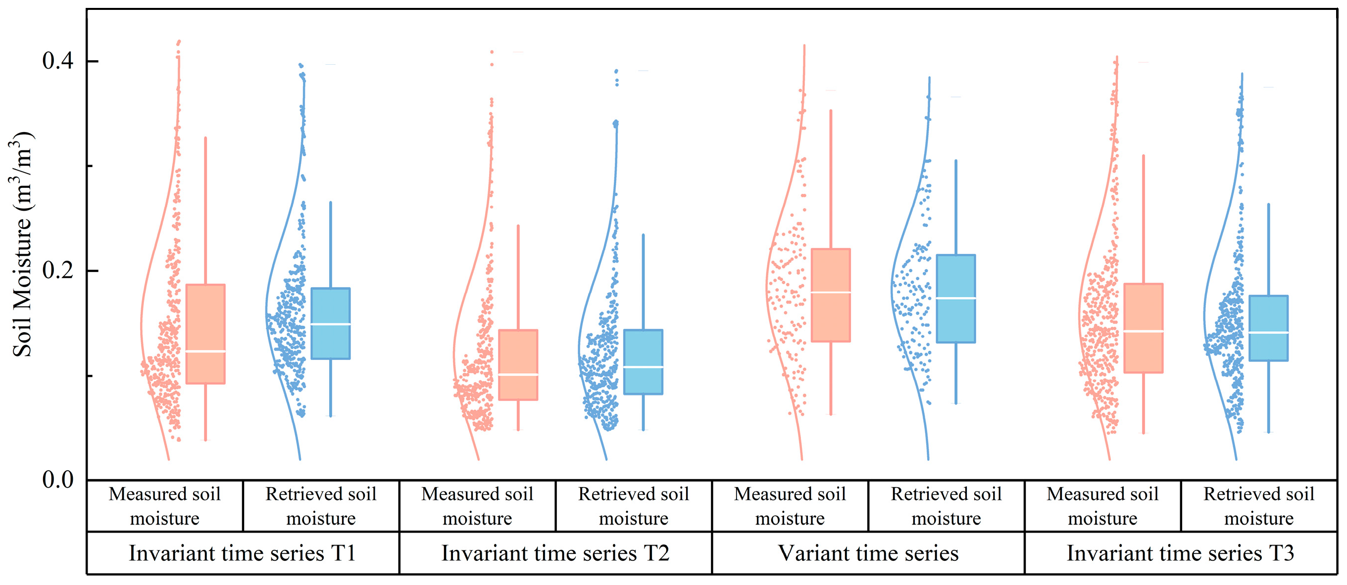 In contrast, invariant time series T2 and T3 incorporated this critical consideration, leading to improved temporal alignment in soil moisture inversion. Although no evident peak displacement occurred in the change time series, the retrieved soil moisture values tended to cluster within a narrow median range, demonstrating substantial deviations from the measured extremes.