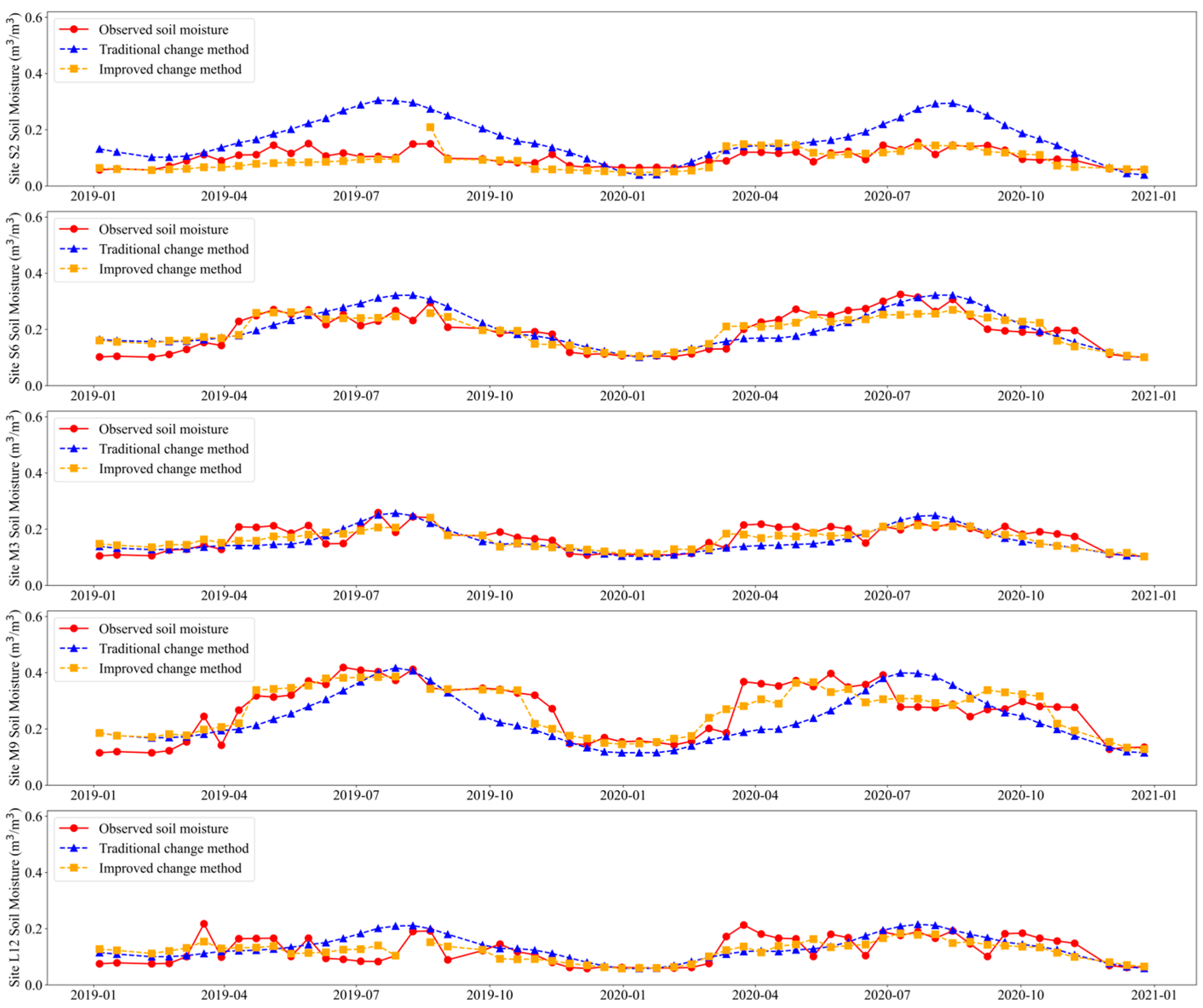 To assess the impact of anomalous events in the time series, we conducted a comprehensive analysis using in situ soil moisture measurements as ground truth. This evaluation compared the temporal patterns of observed soil moisture at five monitoring stations against the corresponding inversion estimates from January 2019 to December 2020. To ensure the reliability of temporal validation at monitoring sites, this study selected three representative sites encompassing the primary land use types within the study area: S2, S6, M9 (grassland), M3 (farmland), and L12 (bare soil). This stratified selection strategy accounts for the distinctive hydrological characteristics and surface properties associated with each land cover category, thereby enhancing the robustness and comprehensiveness of the time-series verification process.