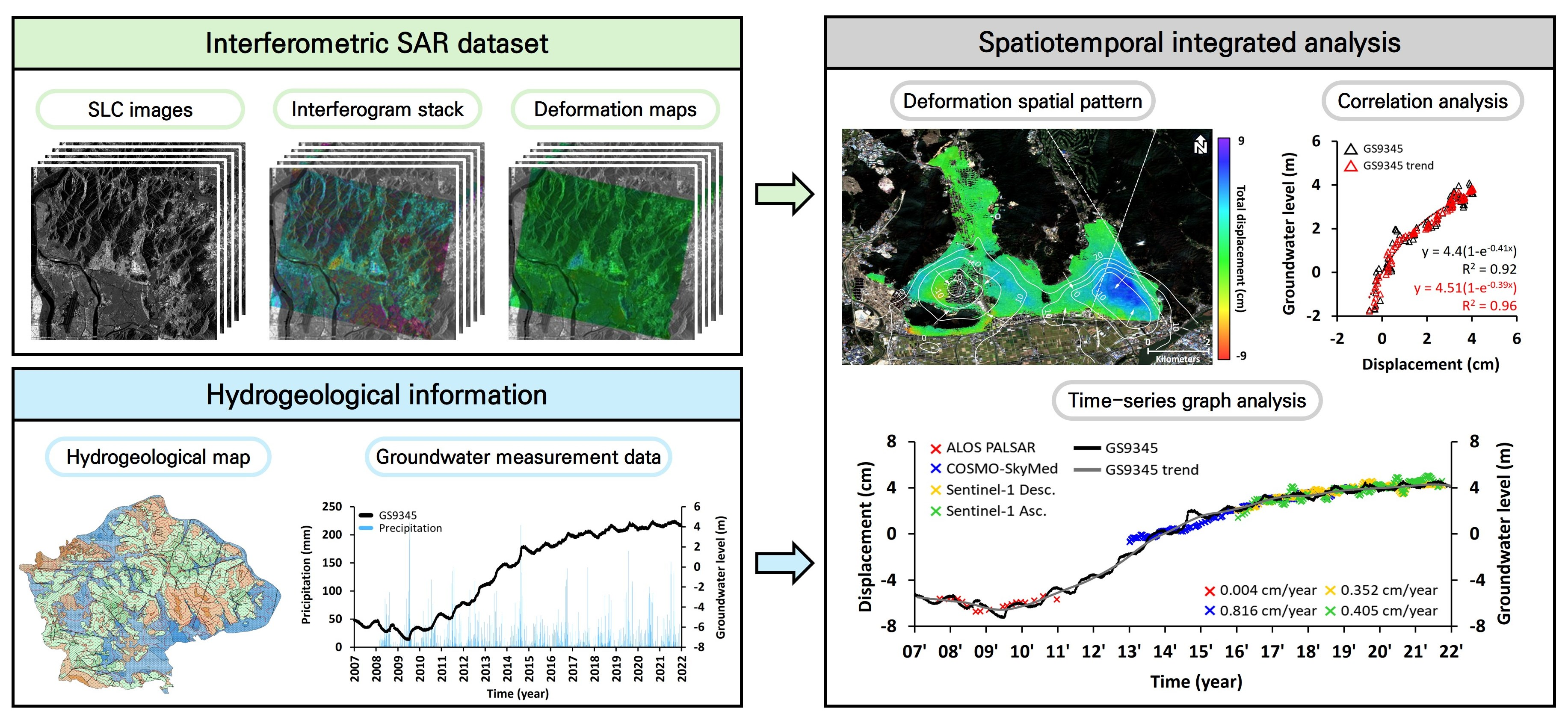 - Analyzing deformation patterns by combining MT-InSAR with hydrogeological data enables the effective inference of subsurface processes.
