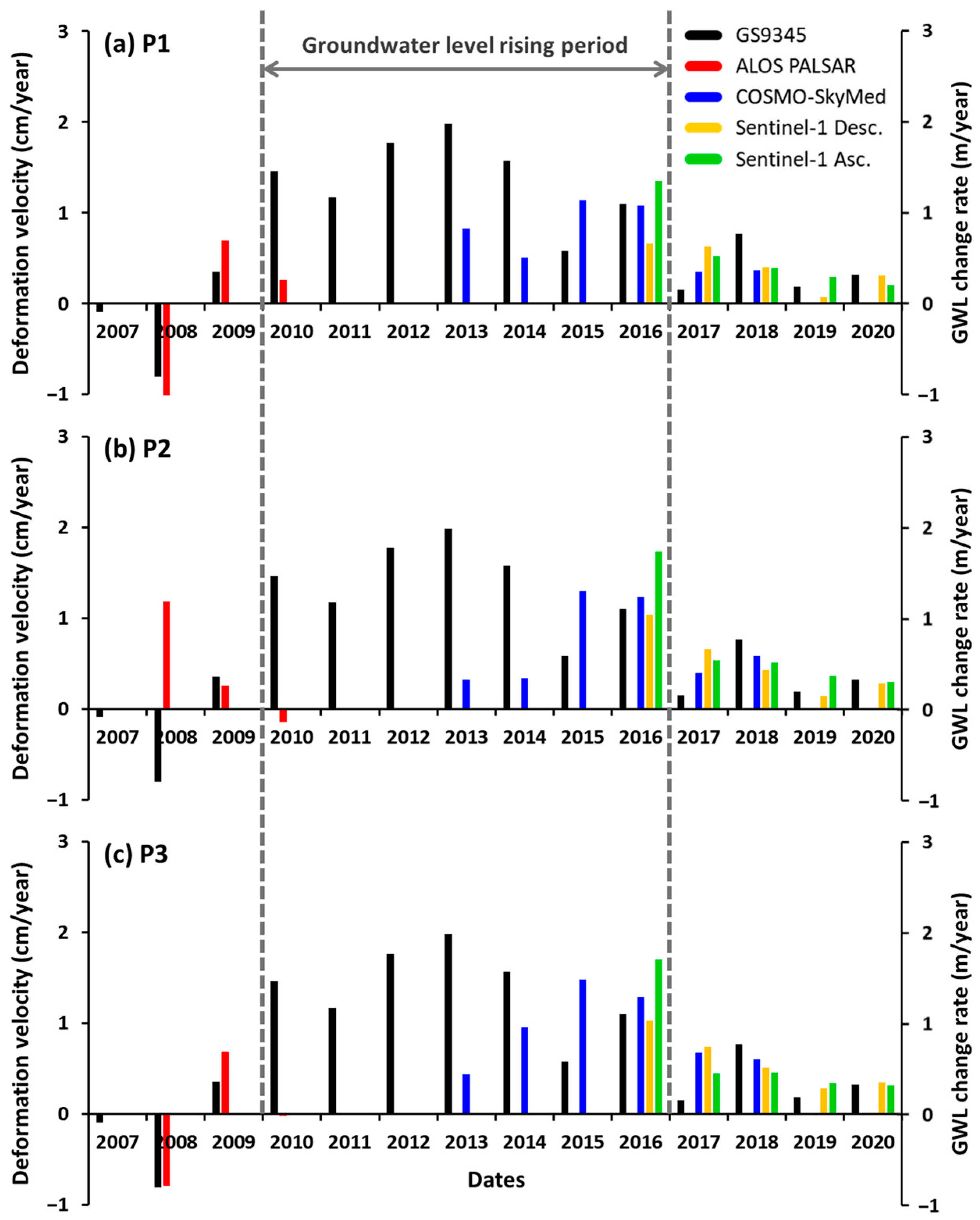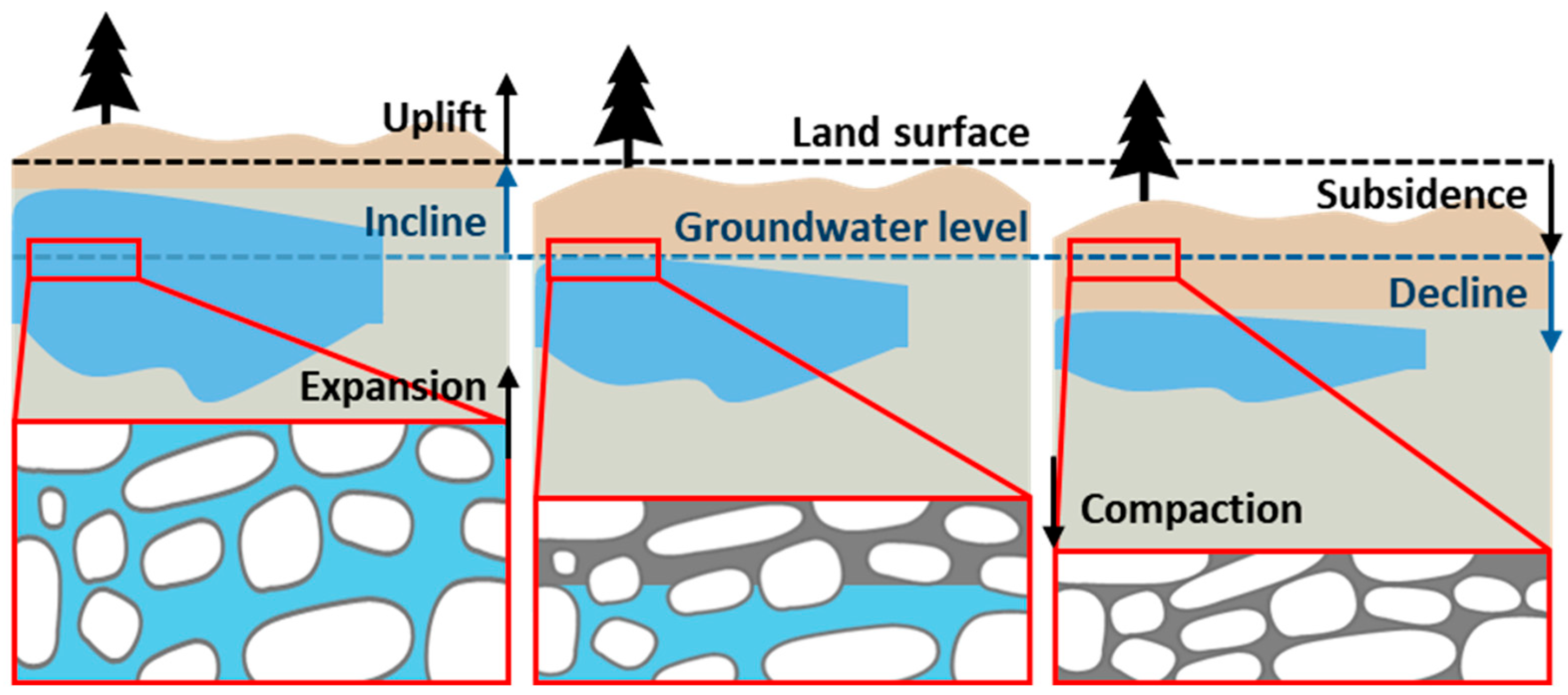 - Normand, J.C.; Heggy, E. InSAR assessment of surface deformations in urban coastal terrains associated with groundwater dynamics. IEEE Trans. Geosci. Remote Sens. 2015, 53, 6356–6371. [Google Scholar] [CrossRef]