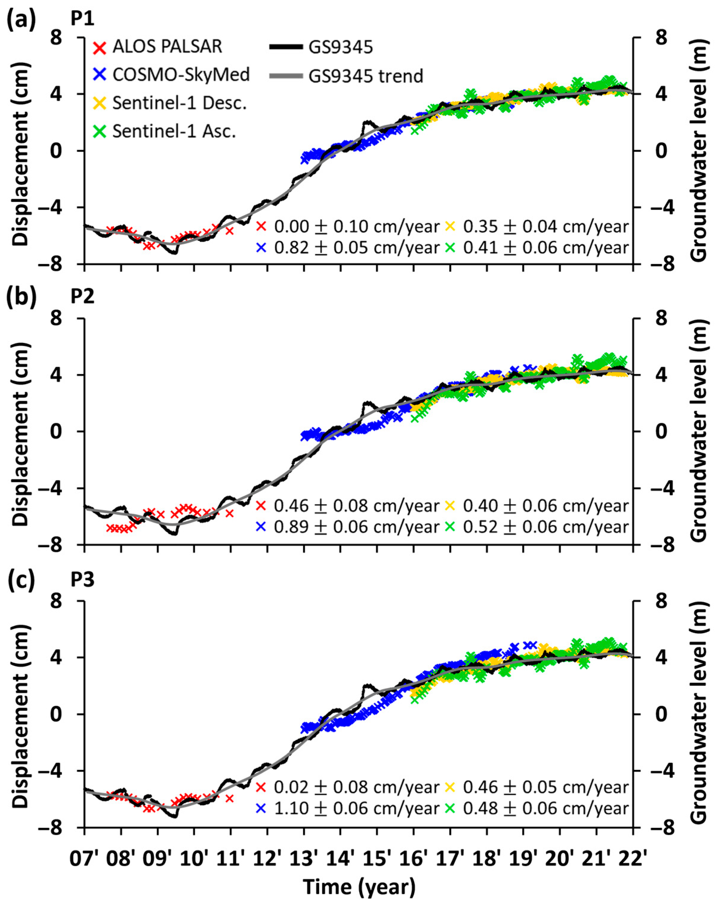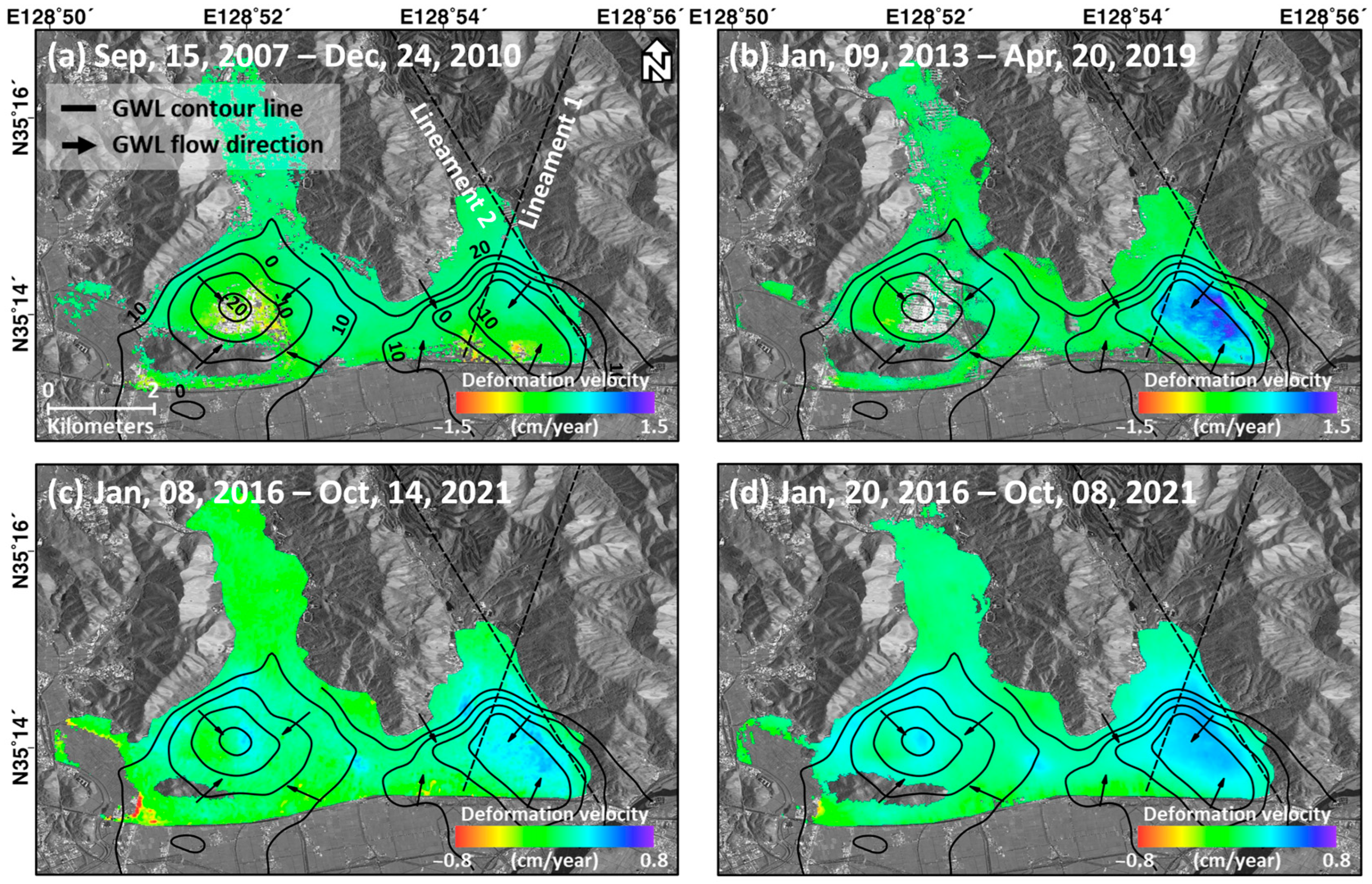 - Ji, K.H.; Herring, T.A. Correlation between changes in groundwater levels and surface deformation from GPS measurements in the San Gabriel Valley, California. Geophys. Res. Lett. 2012, 39, L01301. [Google Scholar] [CrossRef]