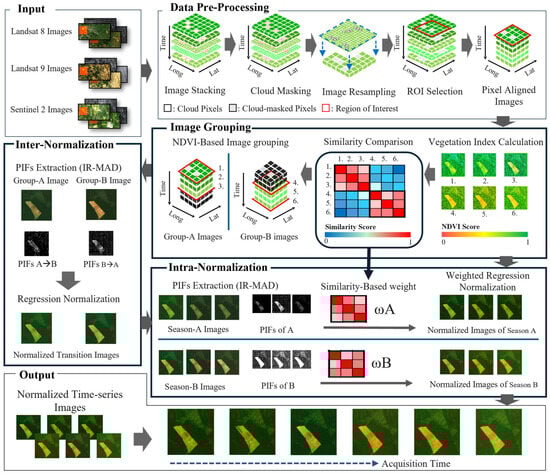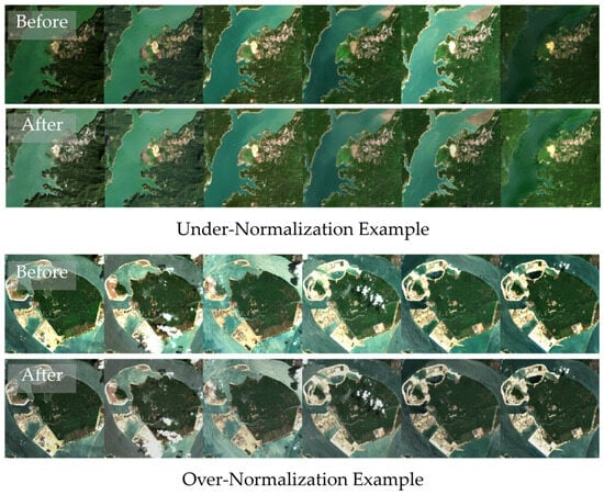 Reflectance normalization is an essential process for the analysis of multi-temporal or cross-sensor satellite imagery [1,2]. This process aims to alleviate temporal reflectance inconsistencies while preserving local temporal patterns such as seasonal changes by adjusting the reflectance of satellite images acquired under different sensors, acquisition days, and environmental conditions onto a common reflectance scale [3]. Such harmonization ensures consistent and reliable reflectance data for remote-sensing applications such as land cover classification, vegetation monitoring, and climate change analyses [4,5,6].