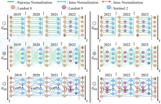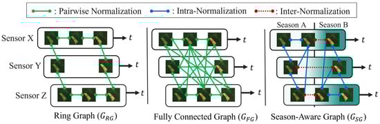 The first structure is a ring graph denoted as , where represents a set of n cross-sensor images sorted by acquisition day, and represents the set of connections between two temporally immediate image neighbors. The graph connects each image only to its immediate temporal neighbors and , forming a closed sequential loop. This structure performs pairwise normalization between adjacent images in chronological order, and the simplicity and low computational cost make the graph suitable for scenarios that require efficient processing while maintaining local consistency. The second structure is a fully connected graph denoted as , where . This structure connects every image to all other images in a dataset, which allows for normalization across all image pairs to maximize information sharing. Hence, the graph can promote global reflectance consistency and normalization stability. The conventional structures, and , represent two cluster configurations. models a simple sequential correction, often resulting in boundary discontinuities (under-normalization) when crossing seasonal cluster. models an overly dense cluster connection, which enforces global consistency at the cost of suppressing vital temporal variability (over-normalization). The third graph is a proposed season-aware graph represented as , which contains q similarity subgraphs and one inter-normalization subgraph . The graph is designed as an adaptive, two-stage architecture that explicitly manages the trade-off inherent in seasonal clustering. It achieves this by structurally separating intra-cluster from inter-cluster transition smoothing.