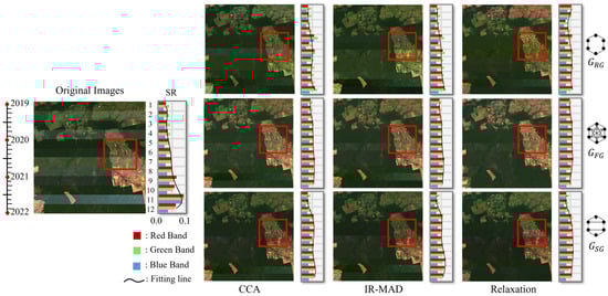 Subsequently, SSIM was employed to assess how well the normalization method preserves the structural integrity of the images relative to reference images. Table 3 presents the SSIM scores of the graphs , , and with the normalization methods CCA, IR-MAD, and the relaxation-based algorithm. The normalization performed with consistently produced the lowest SSIM values, especially for images captured during dry seasons and transitional periods. This degradation can be attributed to abrupt reflectance variations and the absence of seasonal continuity within the graph, leading to insufficient information propagation between nonadjacent temporal neighbors. In contrast, normalization using yields noticeably higher SSIMs across all seasons. Notably, during seasonal transitions, slightly surpasses , likely due to their dense interconnections that can lead to over-normalization. Nonetheless, the overall results demonstrate that normalization with the proposed achieves the most stable and consistent performance, outperforming both and . In particular, relaxation-based normalization paired with achieves the highest SSIM (0.935 for dry-season images), reinforcing the effectiveness of the proposed graph for reliable long-term monitoring using multi-sensor and multi-temporal satellite imagery.