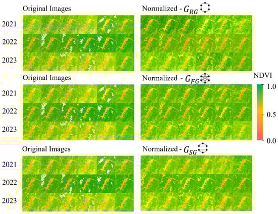 The comparisons of the NDVIs of the normalized image are shown in Figure 8. The images were normalized using relaxation-based reflectance normalization with different graph structures, and the dataset TW is used in the experiment. The NDVIs of the -based normalized images exhibit local consistency but fail to preserve seasonal characteristics. This issue is because of inadequate handling of seasonal transition periods during normalization, which leads to reflectance inconsistencies and distortion of temporal patterns. As for the -based normalization, the NDVIs of the normalized images are visually uniform across seasons, benefiting from its full-connected graph structure. This visual uniformity can benefit short-term monitoring. However, this visually uniform appearance comes at the practical cost of over-normalization, which suppresses seasonal transitions, making the data unsuitable for capturing seasonal dynamics in long-term monitoring. In contrast, the NDVIs of the -based normalized images achieve balanced results in which seasonal identities are preserved and smooth inter-seasonal transitions are maintained.