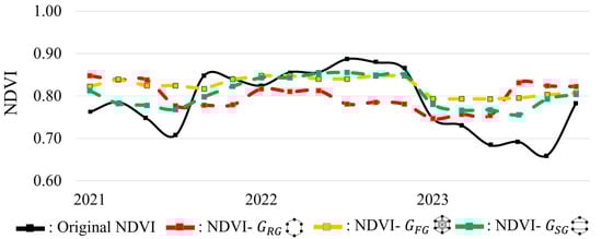 NDVI temporal trends before and after relaxation-based reflectance normalization with the graphs (denoted by red), (denoted by yellow), and (denoted by green). The black solid line represents the original NDVI trend.