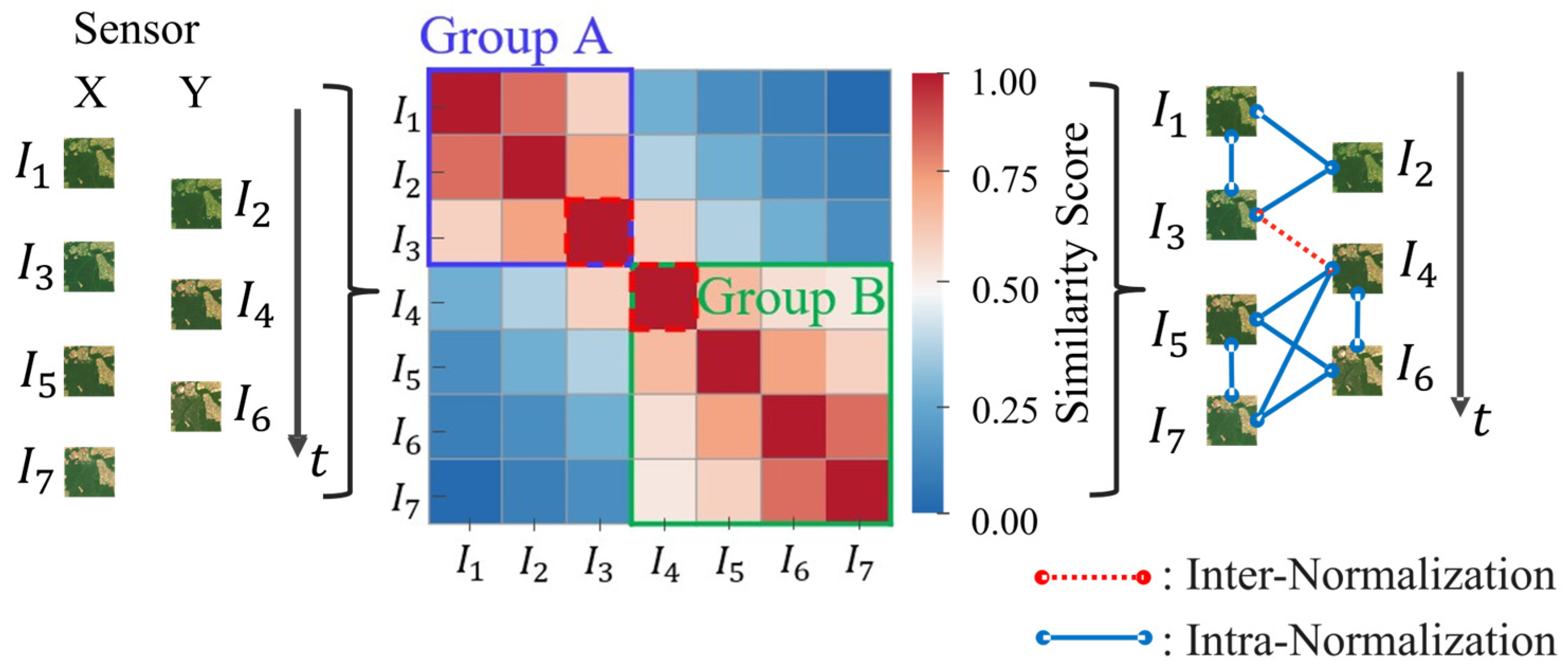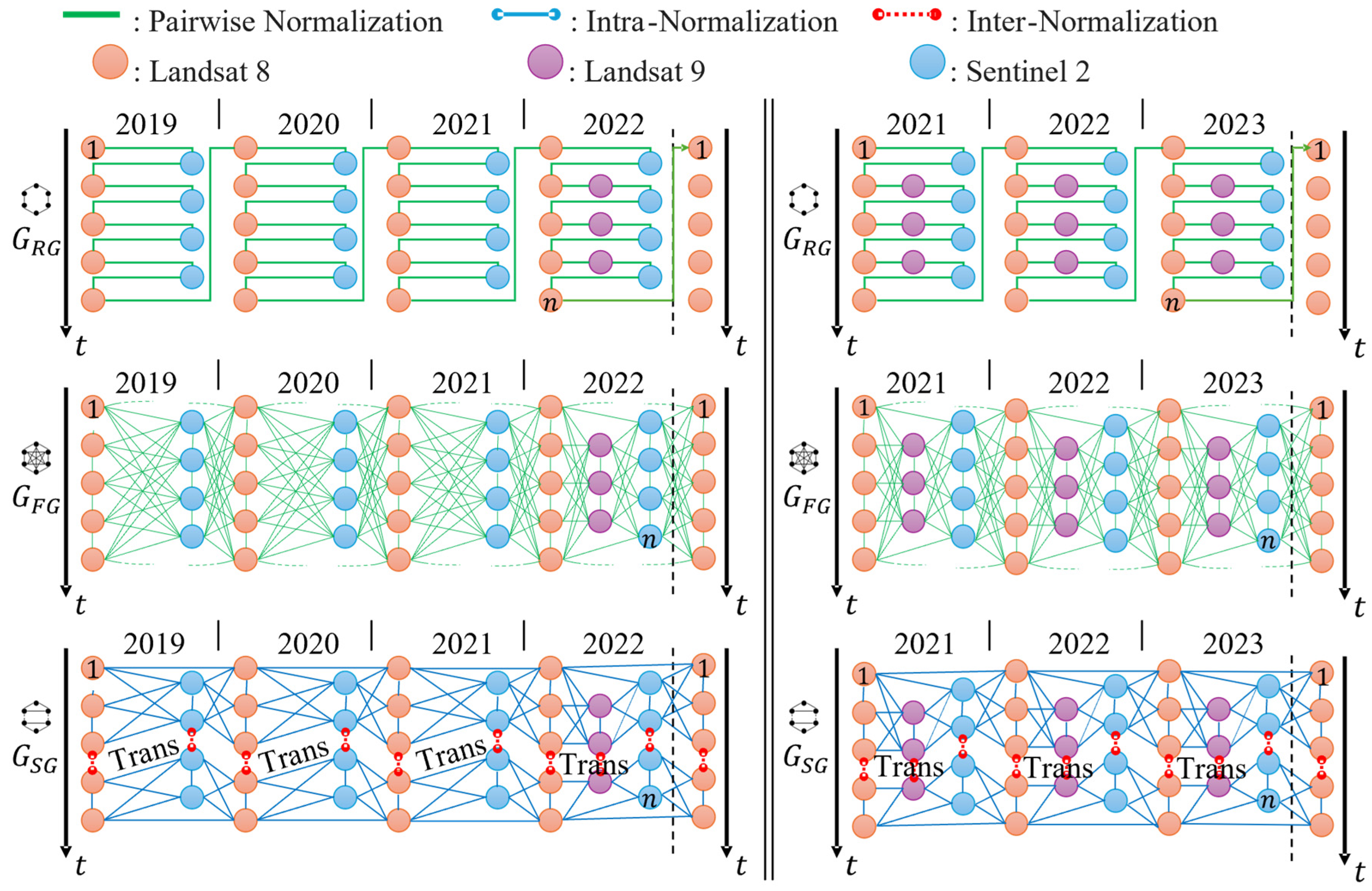 - The proposed graph-based relaxation demonstrates a strong ability to balance reflectance consistency and temporal variability. The method successfully addresses under-normalization and over-normalization, two significant difficulties that commonly distort temporal assessments in multitemporal satellite data through the incorporation of intra-normalization and inter-normalization into a graph-based framework. This balance allows the model to maintain radiometric consistency across different acquisition periods and sensors while preserving the seasonal characteristics of each image, resulting in accurate normalization without significant variance loss.