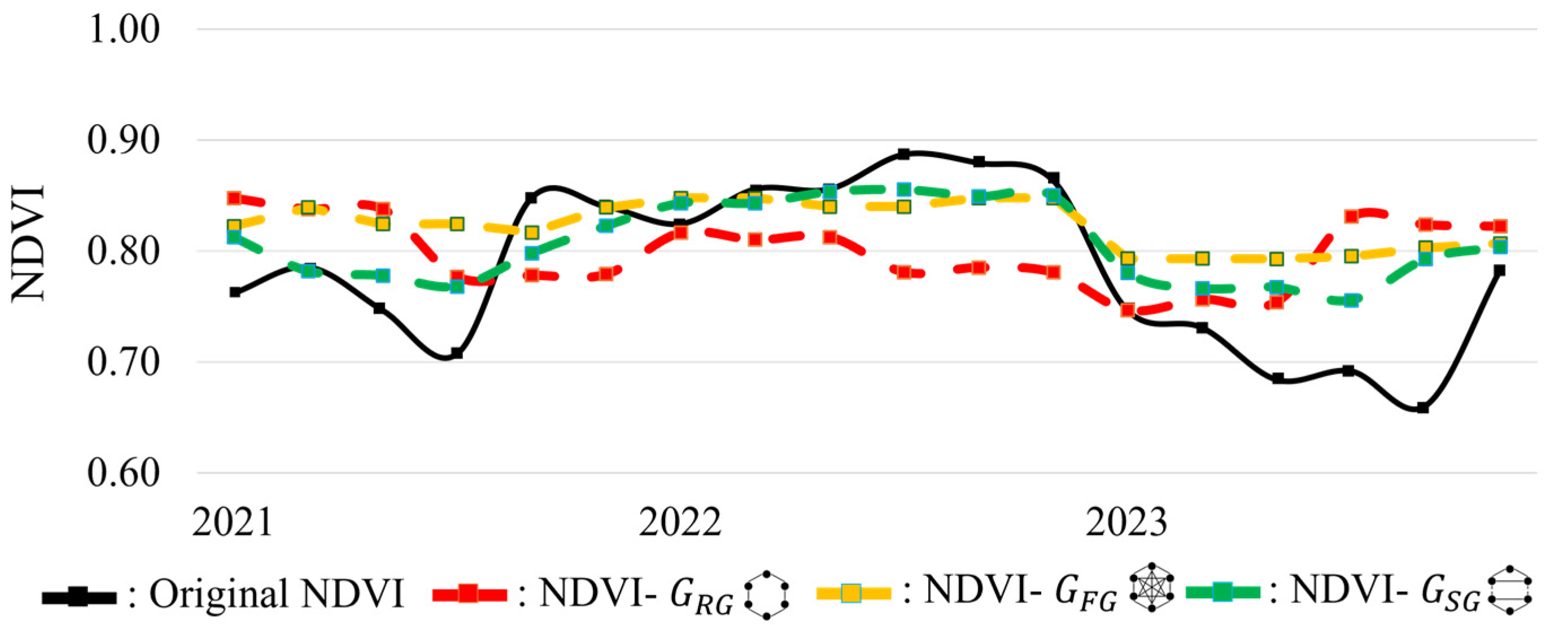 - The proposed method also demonstrated remarkable capability in preserving seasonal and environmental dynamics, particularly in maintaining NDVI trends that reflect natural vegetation cycles. Compared to standard normalization procedures, which frequently result in over-smoothing or temporal discontinuities, the proposed graph-based relaxation preserved seasonal variability while ensuring smooth transitions between distinct periods. As a result, it generated clearer and more realistic representations of vegetation and environmental changes over time, providing higher confidence for long-term monitoring and ecosystem trend assessments.