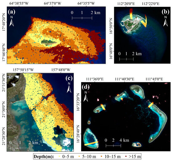 In situ bathymetric data were used as reference measurements to quantitatively assess the accuracy of model-derived depths. The bathymetric data for Kaneohe Bay were collected in 2013 by the U.S. Army Corps of Engineers using the Coastal Zone Mapping and Imaging Lidar (CZMIL) sensor, which has a vertical accuracy (95% confidence level) of meters and a horizontal accuracy (95% confidence level) of meters. The bathymetric data for Buck Island were collected in 2019 by the NOAA National Geodetic Survey using the Riegl VQ-880-G II sensor, with a vertical accuracy (95% confidence level) of 0.121 m and a horizontal accuracy (95% confidence level) of 0.696 m. Both the Kaneohe Bay and Buck Island datasets are publicly available from the NOAA Data Viewer (https://coast.noaa.gov/dataviewer (accessed on 23 March 2025)). The bathymetric data for Yongle Atoll and Yongxing Island were obtained via single-beam sonar measurements acquired in July 2013 and July 2015, respectively, with vertical accuracy better than 0.3 m and horizontal accuracy better than 10 m. These datasets are available from the National Earth System Science Data Center (https://www.geodata.cn (accessed on 3 July 2024)).