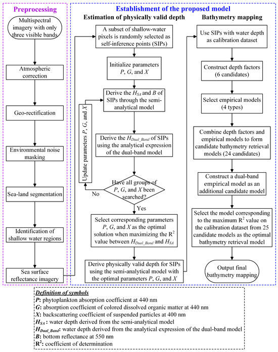 Figure 5 presents a flowchart of the proposed model, which consists of two main components. The first component explains how to integrate the semi-analytical model proposed by Lee et al. [25] with the analytical expression of the physics-based dual-band model developed by Chen et al. [33] to derive physically valid water depths for a subset of shallow-water pixels. The second component describes how to use the water depths from this subset as a calibration dataset to select the optimal model from 25 candidate bathymetry retrieval models, thereby calculating water depth information across the entire study area.
