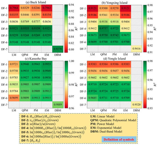By combining the six depth factors described above with the four empirical models, a total of 24 candidate bathymetry retrieval models are obtained. In addition, the widely used dual-band empirical method is included in the evaluation set, resulting in 25 candidate models for identifying the optimal bathymetric retrieval approach. For each model, the coefficient of determination R2 is calculated using the calibration dataset, and the model yielding the highest R2 is selected to estimate water depth across the entire study area.
