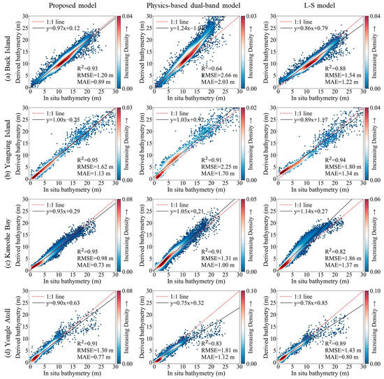 These results indicate that the proposed model consistently achieves superior bathymetry retrieval accuracy across all study areas. Its derived bathymetry closely matches the in situ measurements and clearly outperforms both the physics-based dual-band model and the L-S model, neither of which utilize in situ depth data.
