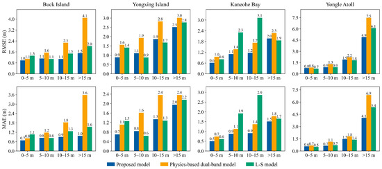 Figure 9 shows that the three models exhibit varying accuracies across different depth ranges. To quantify these differences, the measured depths were divided into four typical intervals (0–5 m, 5–10 m, 10–15 m, and >15 m), and the RMSE and MAE values for each model were calculated within each interval. The results are presented in Figure 10. As shown in Figure 10, with increasing water depth, the RMSE and MAE of the three models in each study area generally show an increasing trend. Furthermore, the proposed model demonstrates a clear accuracy advantage across all depth intervals in each study area. Detailed results are provided below: