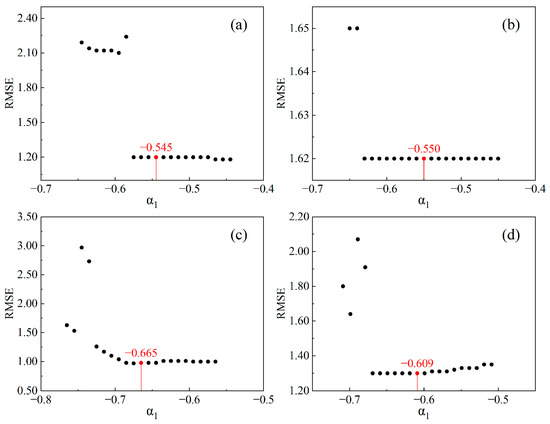- Step 5: Adjust parameters P, G, and X according to their predefined ranges and step sizes, and repeat step 4 until all combinations of P, G, and X have been searched. This is a brute-force search process. When the coefficient of determination R2 between and reaches its maximum value, the corresponding values of P, G, and X are considered optimal. Notably, the ranges of P, G, and X are determined with References [32,34], and their search step sizes are empirical values chosen to balance accuracy and computational efficiency. The parameter ranges and step sizes of the model are provided in Table 1.