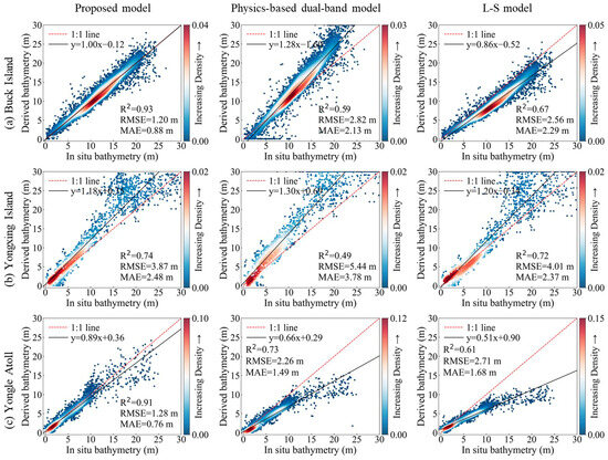 - Yongle Atoll: The proposed model achieved an RMSE of 1.28 m, an MAE of 0.76 m, and an R2 of 0.91. This corresponds to a 43% reduction in RMSE, a 49% reduction in MAE, and a 0.18 increase in R2 compared to the physics-based dual-band model, as well as a 53% lower RMSE, a 55% lower MAE, and a 0.30 higher R2 relative to the L-S model.