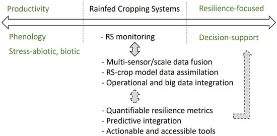 While existing reviews on remote sensing applications have summarized available sensor platforms and their usage [13] or explained the physiological relevance of spectral bands [12,13], this review narrows the focus to synthesize recent methodological advances in applying remote sensing to enhance resilience in rainfed broadacre cropping systems (e.g., cereal, maize, rice, soybean). Specifically, the review addresses three principal themes: (1) crop productivity monitoring (production and yield gaps estimation); (2) crop phenology monitoring and modeling (growth stages and development shifts); and (3) crop stress detection and assessment (abiotic and biotic stress). By integrating insights across these domains, this review highlights how RS technologies are evolving from monitoring tools toward comprehensive decision-support systems that can inform adaptive management and strengthen resilience under climate change. This paper is structured to first review thematic advances and limitations in RS applications, then examine integration trends and challenges toward resilience, and finally outline future directions.