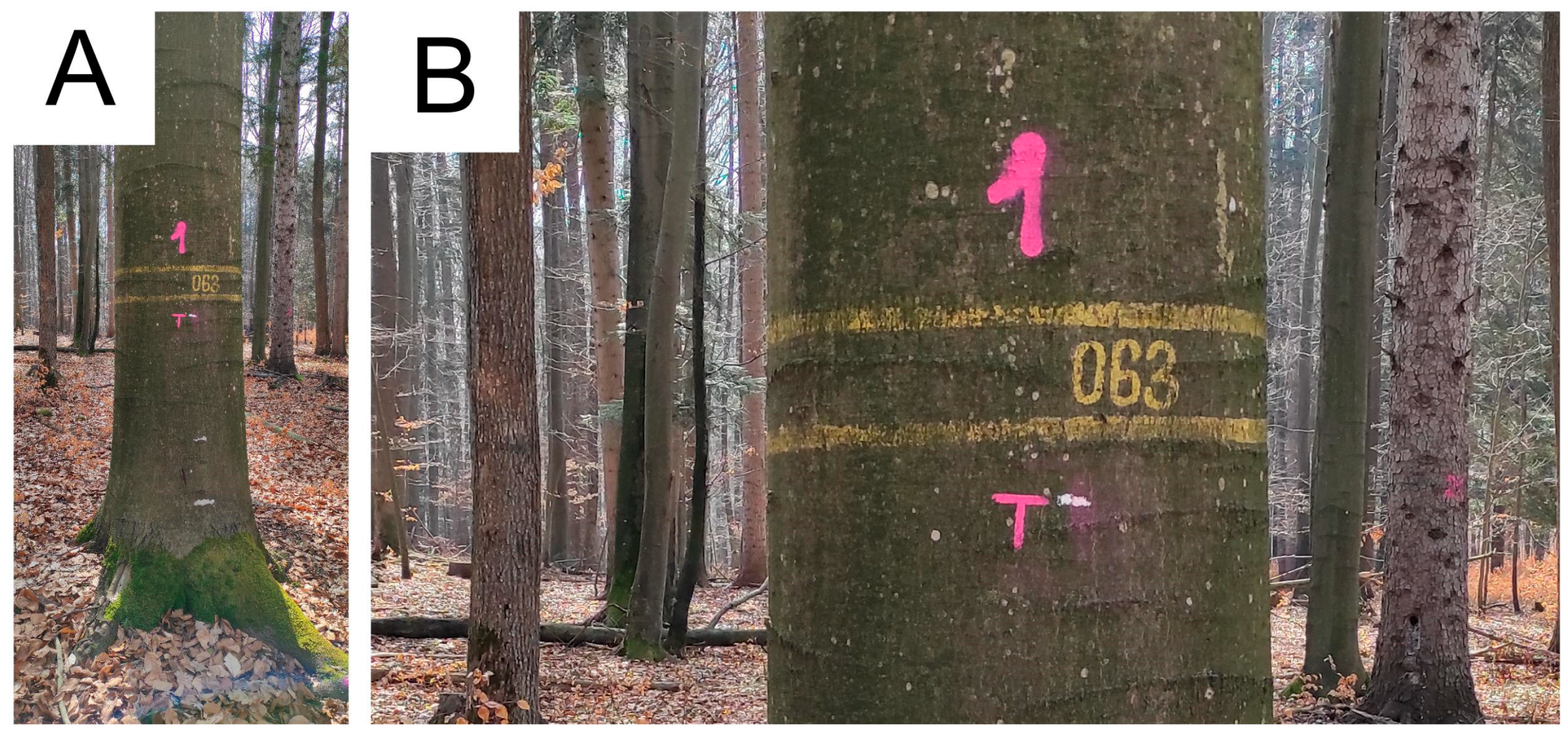 Data collection took place during the period from September 2024 to February 2025. In total, DBH was measured on the 120 trees. The trees were numbered, and each tree was permanently marked at a height of 1.3 m (