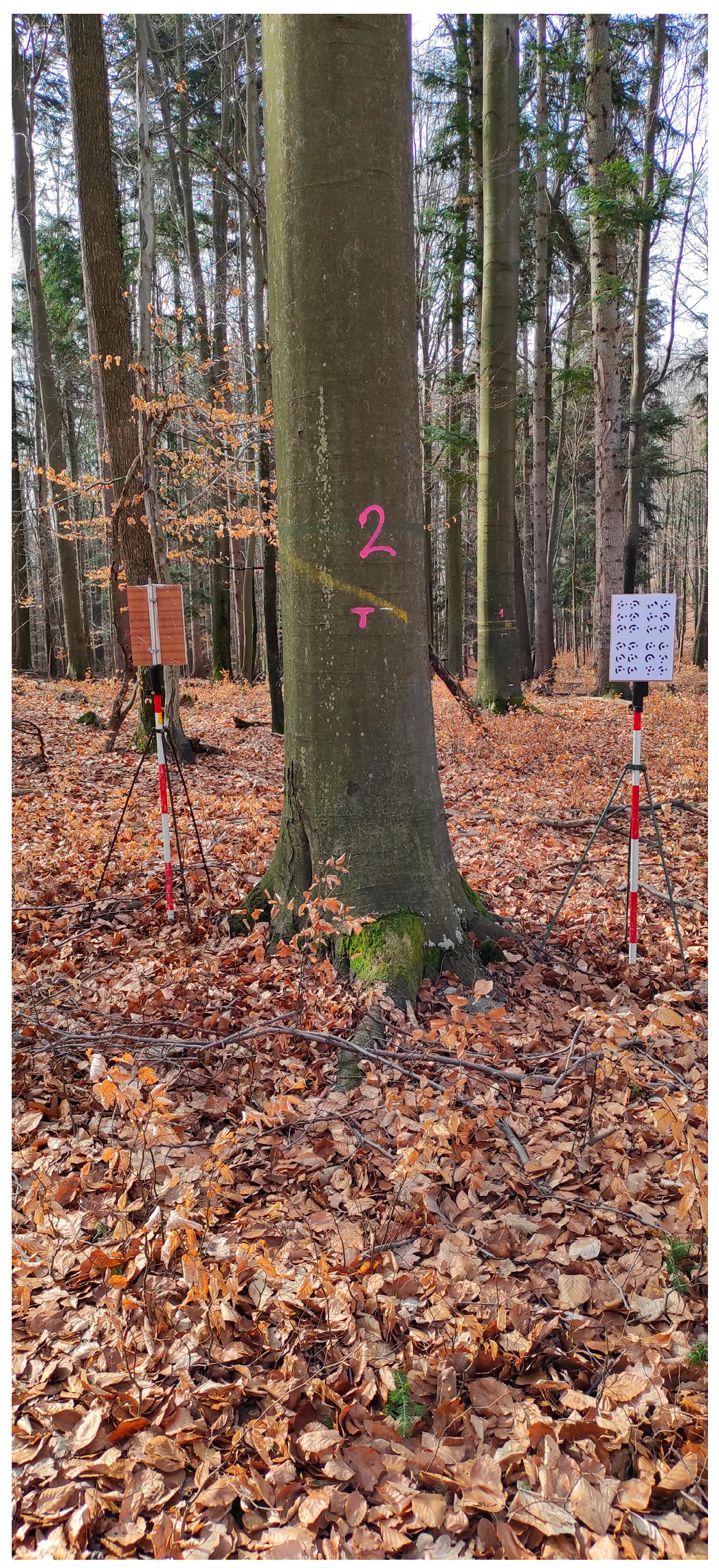 Before image acquisition, two A4 sheets printed with photogrammetric markers (24 per sheet) were installed on the prism pole and placed near the trunk (<1 m away). The targets were rotated in the opposite direction of the rounding tree (