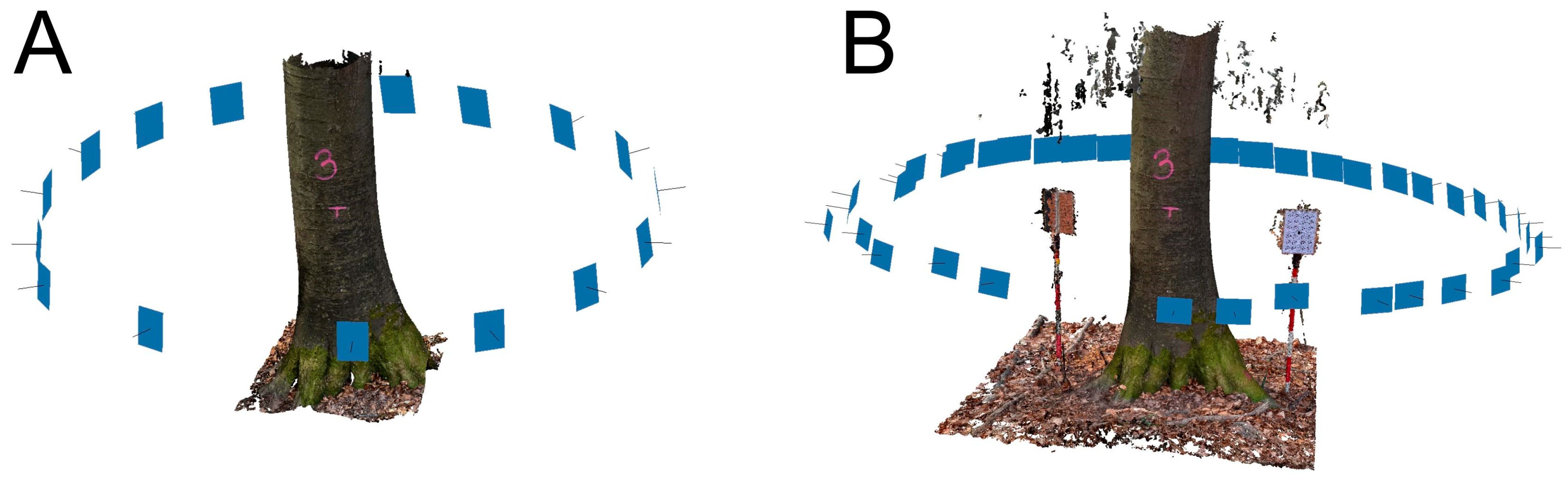 Figure 3). These markers were used for scaling and orienting the point clouds. For scaling purposes, only one sheet was required, but multiple sheets were used to verify accuracy. For all approaches later processed by photogrammetry, each tree was circled at an approximate distance of 2 m from the trunk to ensure that the lower stem section and surrounding ground were sufficiently captured.