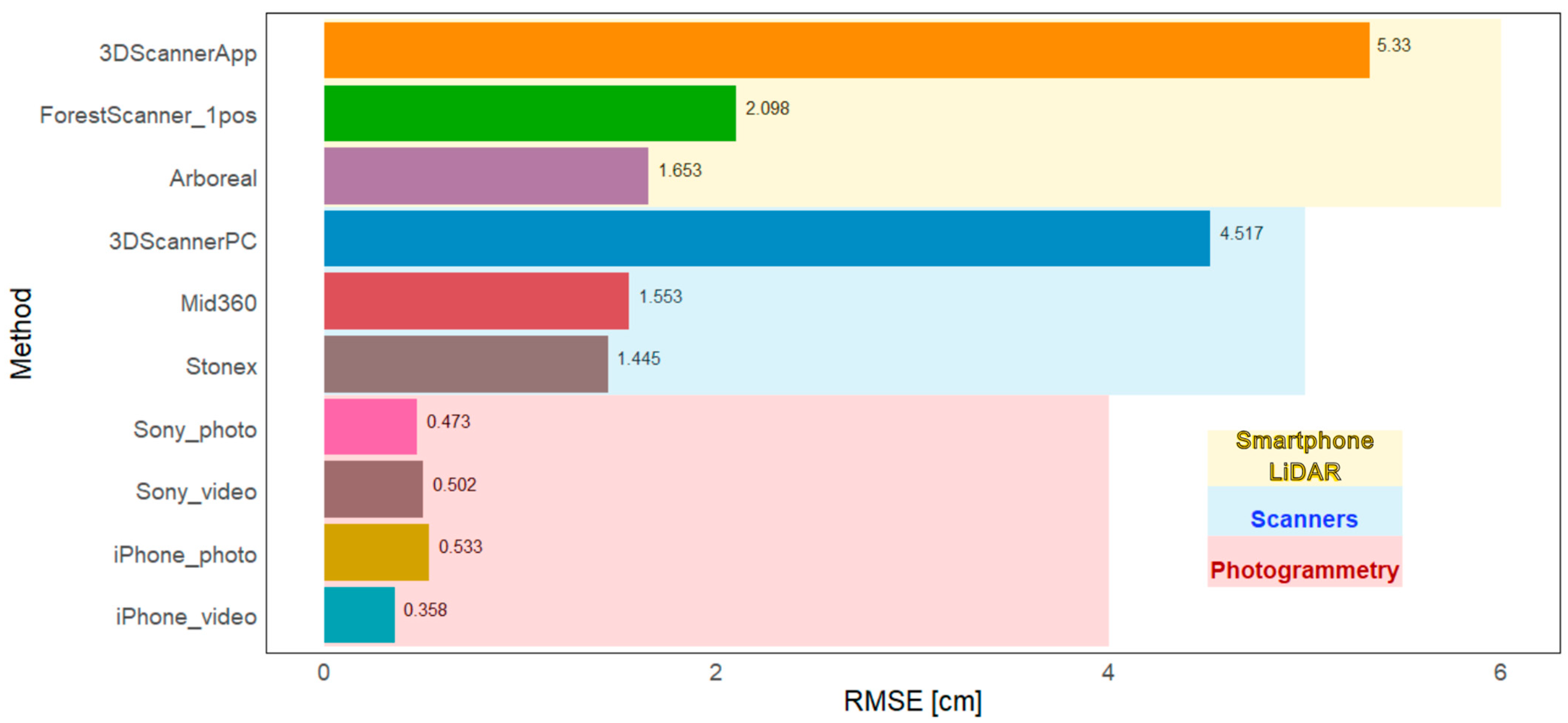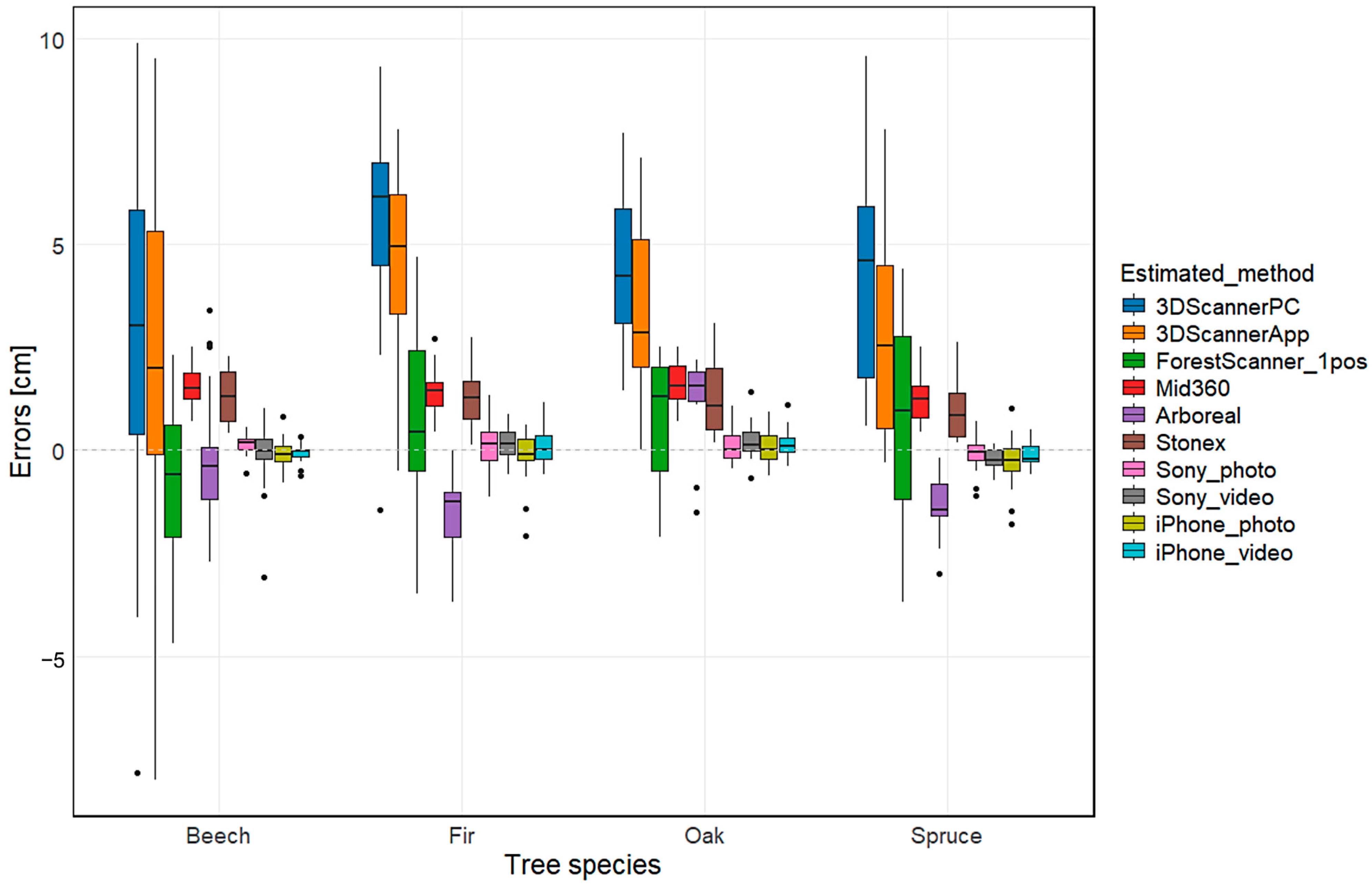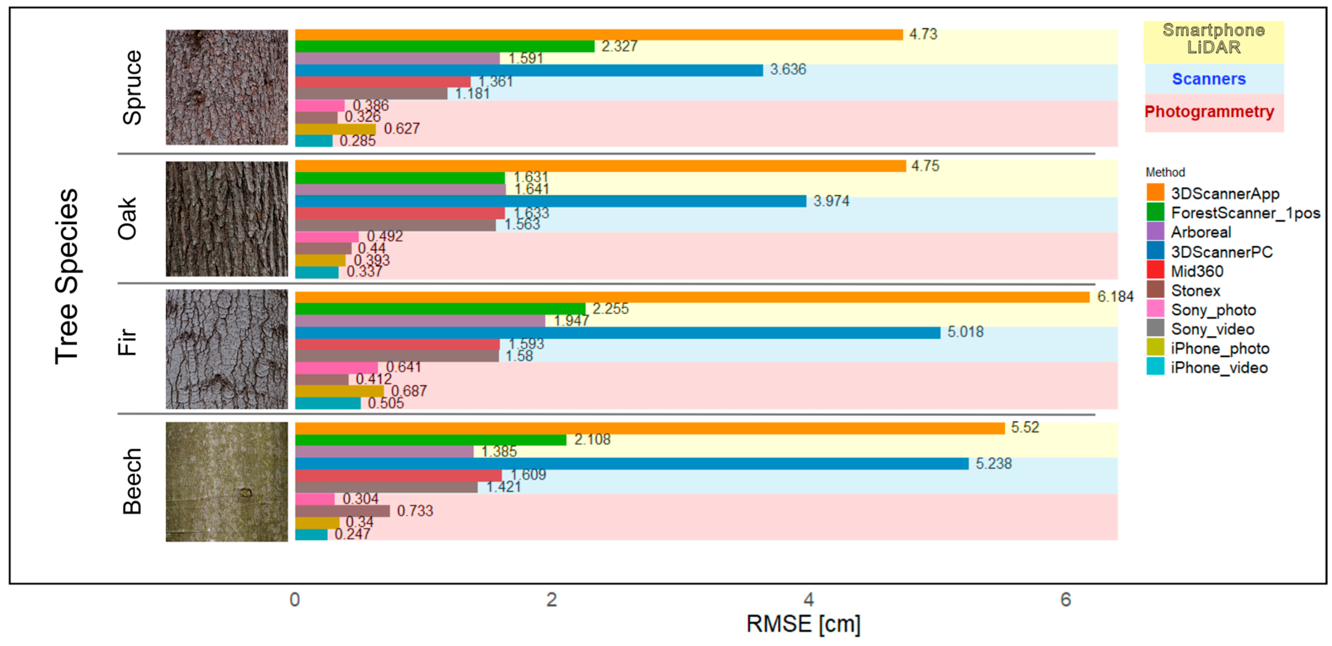 Figure 10). On the other hand, the accuracies for Beech were above the average for the 3DScanner (both in-app and point cloud measurements), where the RMSEs compared to Spruce and Oak even exceeded one centimeter. Such a difference could be considered significant from the practical point of view. Regarding the 3DScanner, the highest RMSEs were observed for Fir, which also has relatively low-structured bark. The results for Oak as the species with the most structured bark from tested species are consistent within the groups of methods, excluding the aforementioned 3DScanner. Even for the ForestScanner app, where the RMSEs of other species exceeded two centimeters, the RMSE for Oak is 1.63 cm, thus very close to RMSE achieved using the Arboreal app. For other species, especially Spruce and Beech, the Arboreal provided apparently lower RMSEs compared to ForestScanner. Regarding the handheld laser scanners, the best results were achieved for Spruce with RMSEs lower than 1.4 cm. However, the results for other species are different only by few millimeters and for all species the handheld scanners provided errors between 1.2 and 1.6 cm.