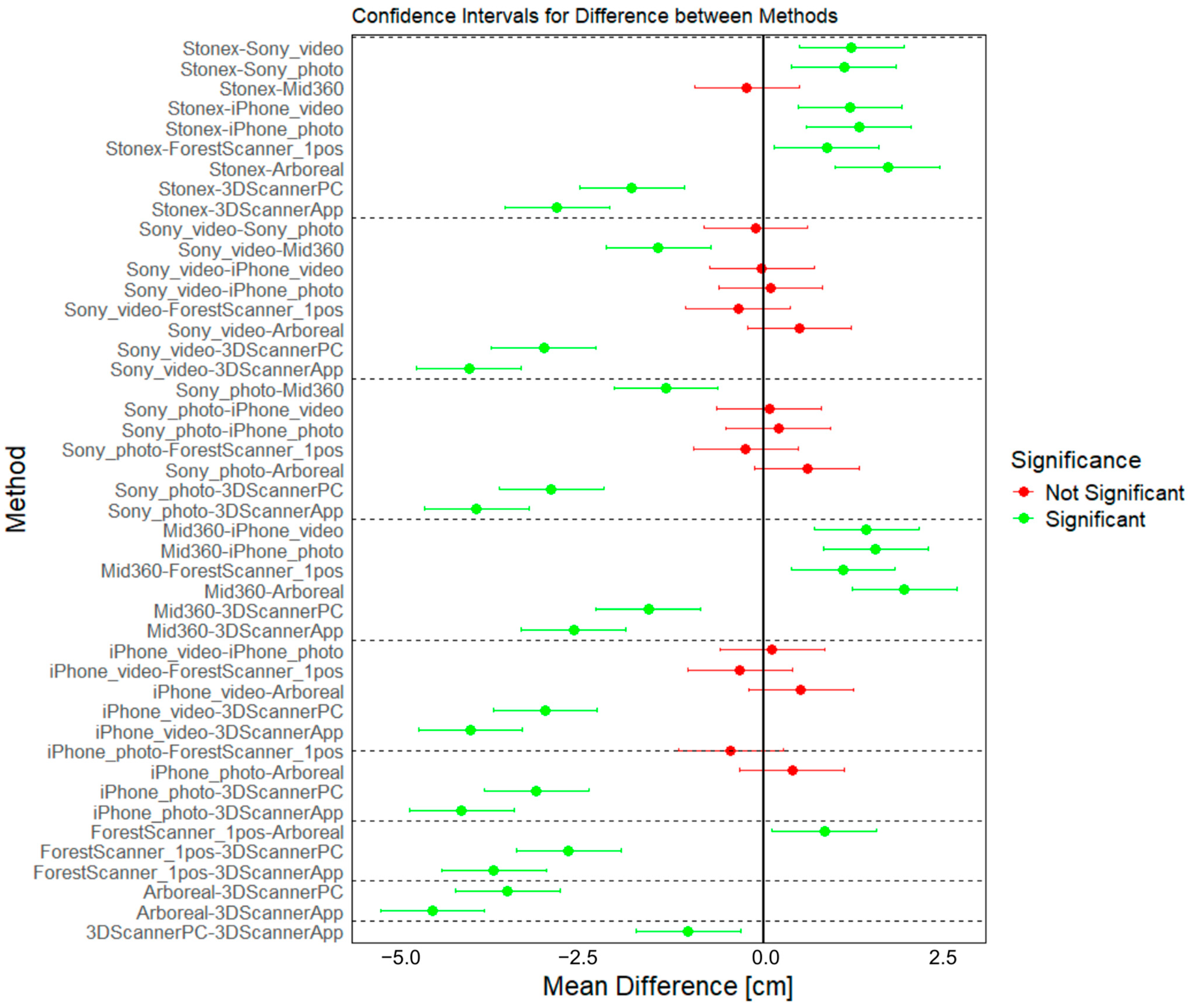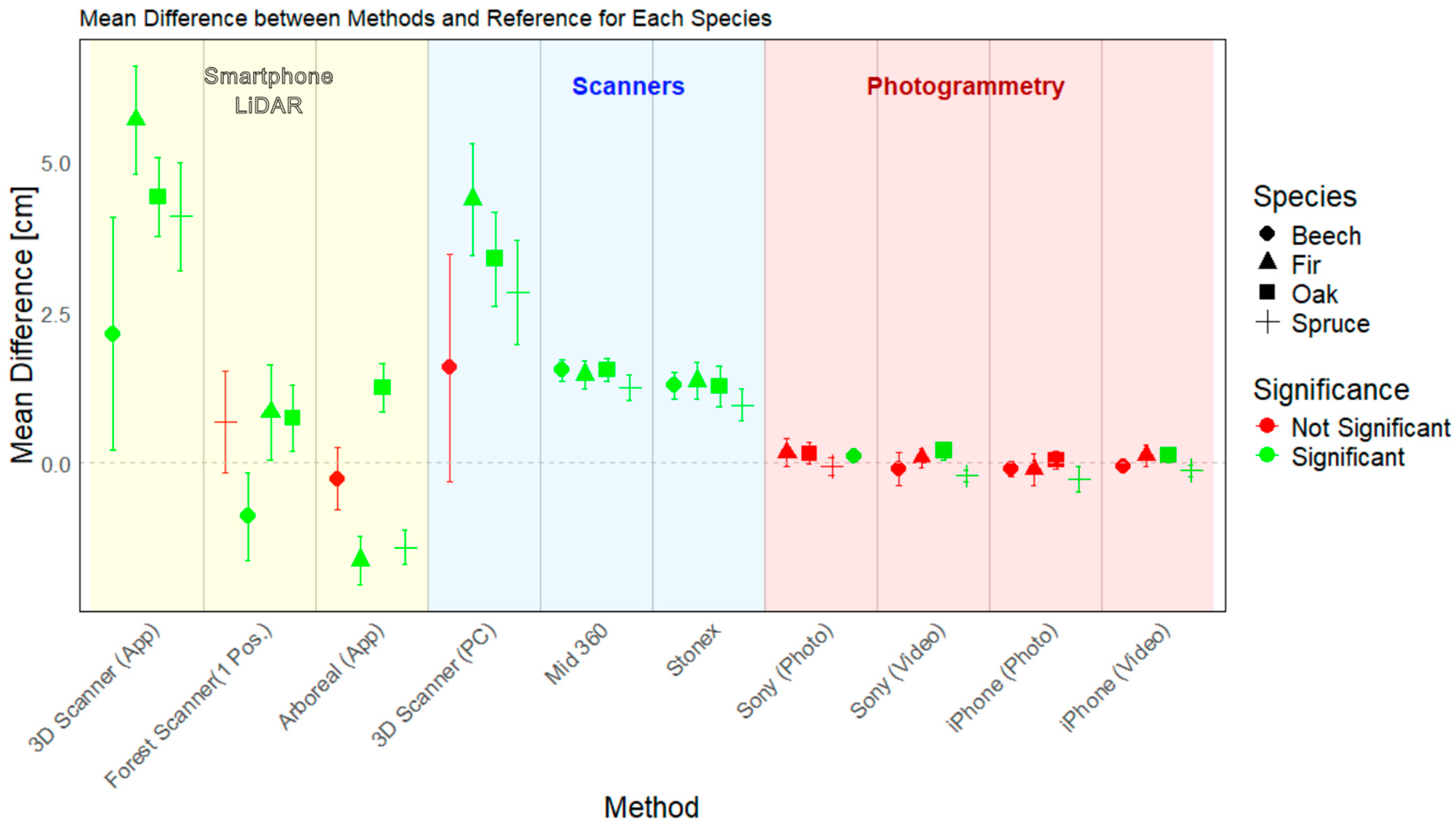 Figure 9). The largest discrepancies were observed for general-purpose tools such as the 3DScanner, whereas specialized forestry applications like Arboreal or ForestScanner delivered more stable results and are therefore closer to potential operational use, even though their accuracy remains lower than that of photogrammetry. The comparison of methods further indicates that the absence of statistically significant differences does not necessarily reflect comparable accuracy. In the case of Arboreal and ForestScanner, the relatively high variability leads to overlapping confidence intervals with photogrammetric approaches (