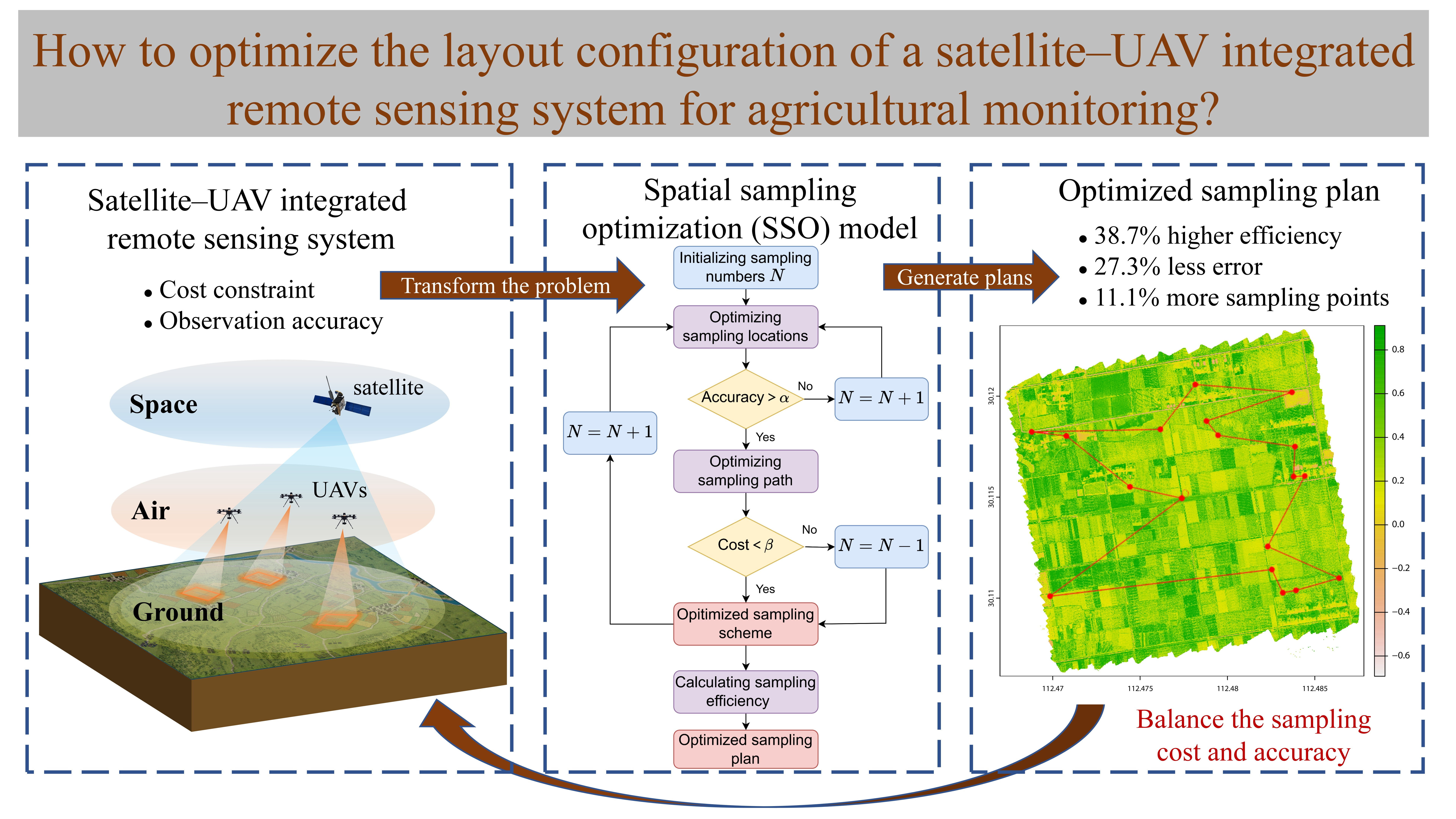 - Layout configuration of satellite–UAV integrated remote sensing was transformed into a spatial sampling problem.