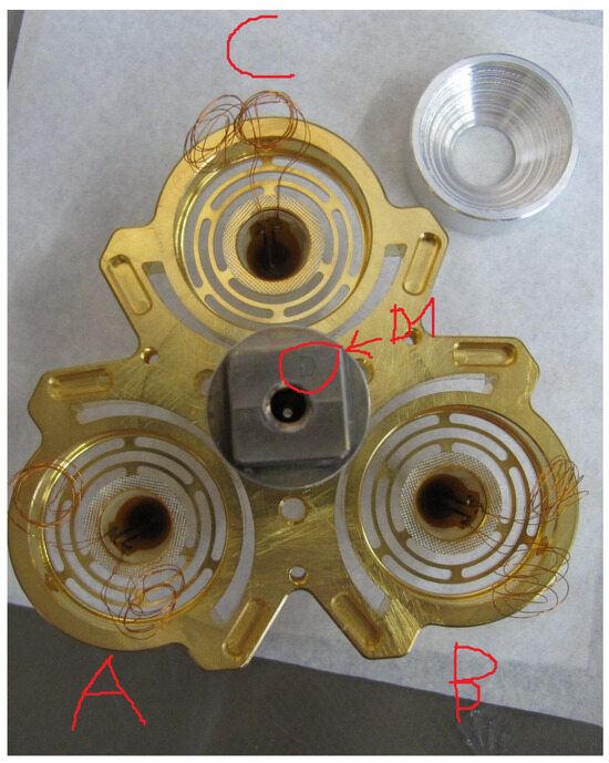 The DARA heat sink assembly, showing the conical cavities (designated by the letters A, B, and C) connected to their respective heat links (labyrinth structures). The sun sensor will be installed in the central position (D1). Note that this photo was taken before the internal black coating was applied to the cavities.