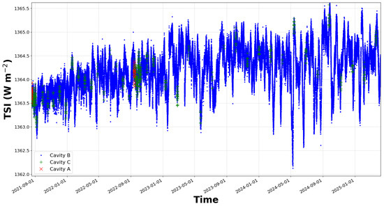 Wm−2, and 1359.08 Wm−2 for cavities A, B and C respectively. Figure 2 shows the recorded TSI observations (WRR scale) for channel B (blue), C (green), and A (red). To ensure data quality and remove potential outliers, the time series is filtered using data from the onboard sun tracker, selecting only those observations where the instrument is properly aligned with the sun. The resulting time series, therefore, shows a high degree of consistency. The clear upward trend since July 2021 corresponds to the rising solar activity in the solar cycle 25, which follows the solar minimum in December 2019 (the end of cycle 24). For further detail, a zoom-in of this figure is available in Appendix A (see Figure A3).