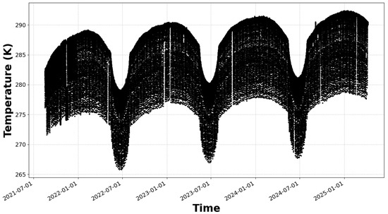 A specific feature of this mission is the rotation of the JTSIM platform every 4 days in order to perform the Deep Space (DS) measurements, which were only used during the commissioning phase in order to evaluate mainly the DS corrections [13,14]. During these measurements, the cavity of the radiometers exchanges radiation with a different thermal background in the open-shutter state, when the cavity radiates to deep space, compared to the closed-shutter state when the cavity’s thermal emission is reflected by the (gold-coated) backside of the shutter. The DS correction is then required to compensate the thermal background effect, which is linked with the geometry of the cavity and the electronics of the instruments [13,27]. The platform movement is hard-coded in the spacecraft software system and can be neither interrupted nor overwritten. During this maneuver, the cavity temperature variations look like a seesaw dropping between 6 K and 14 K over a period between 1 h 30 and 5 h. Figure 3 and Figure A2 (see Appendix A) display the cavity temperature of the nominal cavity B with an emphasis on the large excursions. These variations are artificial due to the DS measurements and the satellite maneuvers. In particular, the temperatures decrease every year from May to August and then increase again. This specific feature results from a series of small maneuvers of the satellite to rotate the spacecraft and the solar panels. Note that a correction must be applied to the data to account for the thermal expansion or contraction of the precision aperture area (i.e., thermal aperture correction). The thermal coefficient of the aperture area is estimated to be 12 ppm per degree Celsius. This aperture-area temperature-correction factor is calculated as a function of the DARA cavity temperature [13].