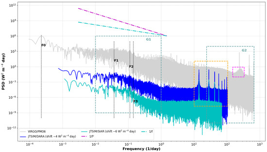 In the PSD of the the minute-rate time series, we look at two frequency bands: G1 at [1–100] days and G2 at [1–60] min. The G1 frequency group is generally associated with the solar activity with events varying over days or longer [17,21,30,31]. The vertical dotted lines (black) F0, F1, F2, and F3 are associated with the frequencies at 11.5 years, 27 days, 9 days, and 7 days, respectively. These frequencies correspond to the 11.5 year solar cycle, the solar rotation (27 days), and its third and fourth harmonics (9, 7 days). Below 1 Hz/day, we observe photospheric activity associated with P-modes ( ∼5 min), granulation (ranging from ∼6 to 16 min), meso-granulation (from ∼16 to 166 min), and supergranulation (extending up to 1 day) [29,30]. The DARA and SIAR frequency spectrums display peaks at min and sub harmonics up to the seventh order (i.e., min, min, min, min, min, min). All these frequencies are undoubtably related to the signal from the spacecraft’s own revolution, which is 101 min. The first four harmonics are exactly matching between the PSD of SIAR and DARA. As the SIAR dataset is shorter and contain more gaps, presumably due to a postprocessing filtering, the rate is lower than DARA (i.e., 13 min and 19 min for DARA and SIAR, respectively). Moving to higher frequencies (periods of 5 min and below), this regime is where one would expect to find signals from solar P-modes, which have their dominant periods clustered around 5 min as seen clearly on the VIRGO/PMO6 PSD. Previous works [29,30] demonstrate that in the granulation, the meso-granulation, and super-granulation no activity can be detected in the VIRGO/PMO6 spectrum due to the level of the signal-to-noise ratio. At high frequency, separating the contributions of frequencies arising from the satellite’s orbital motion, different solar rotation modes, and instrumental effects (e.g., cavity temperature variations) remains a significant challenge [31].