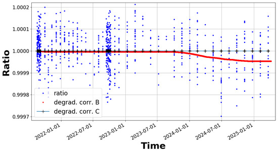 A comparison of degradation between DARA’s nominal channel (cavity B) and backup channel (cavity C) as a function of time (UTC). The blue dots show the ratio of their respective observations (cavity B/cavity C). The degradation curve for cavity B is shown as a red line. The degradation for cavity C is plotted as black crosses, indicating no significant degradation over this period.