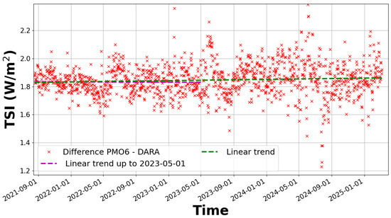 Difference between the daily PMO6v8 product and the degradation-corrected TSI time series. Two linear trends are displayed: the purple curve stops in early 2023, whereas the green curve fits all the available data until April 2025.