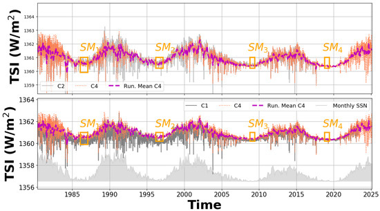 New composite (C4, orange) based on merging 45 years of TSI measurements. For comparison, C2 [25] and C1 [17] are also shown (grey line). A 30-day running mean of C4 is shown as a yellow/purple dashed line. The orange boxes are associated with the solar minima (SM) for each solar cycle described in Table 3. Note that the monthly sunspot number is also included as an empirical scale to provide context for solar activity.