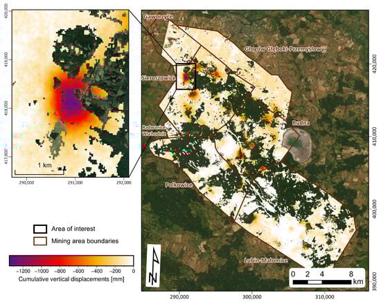 Application of the SBInSAR time series method on a dataset of unwrapped DInSAR interferograms, together with LOS displacement decomposition, allowed us to obtain a time series of vertical ground surface displacements for the LGCD mining area. Total vertical displacements measured from 20 May 2016 to 26 October 2020, cropped spatially to the extent of the LGCD area, are shown in Figure 2. Temporal coherence masking allowed the removal of time series data with low reliability, located particularly over forest-covered areas and water bodies.