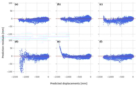 Relationships between predicted displacement values and the corresponding residuals (defined as differences between actual and predicted values of displacement) were examined using residual plots (Figure 4 and Figure 5), providing a visual means of assessing potential heteroscedastic patterns and biases in the forecasting results.