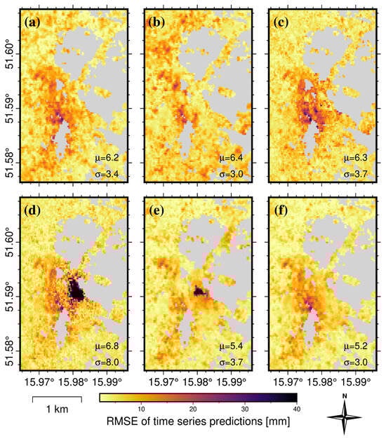 Figure 10. Maps of RMSE values calculated with time series predictions compared to actual InSAR displacements. Based on predictions developed using models with forecast horizon of 30 time steps (multi-step long-term forecasting): (a) Holt–Winters exponential smoothing; (b) ElasticNet Regression; (c) random forest regression; (d) XGBoost; (e) N-BEATS; and (f) LSTM.