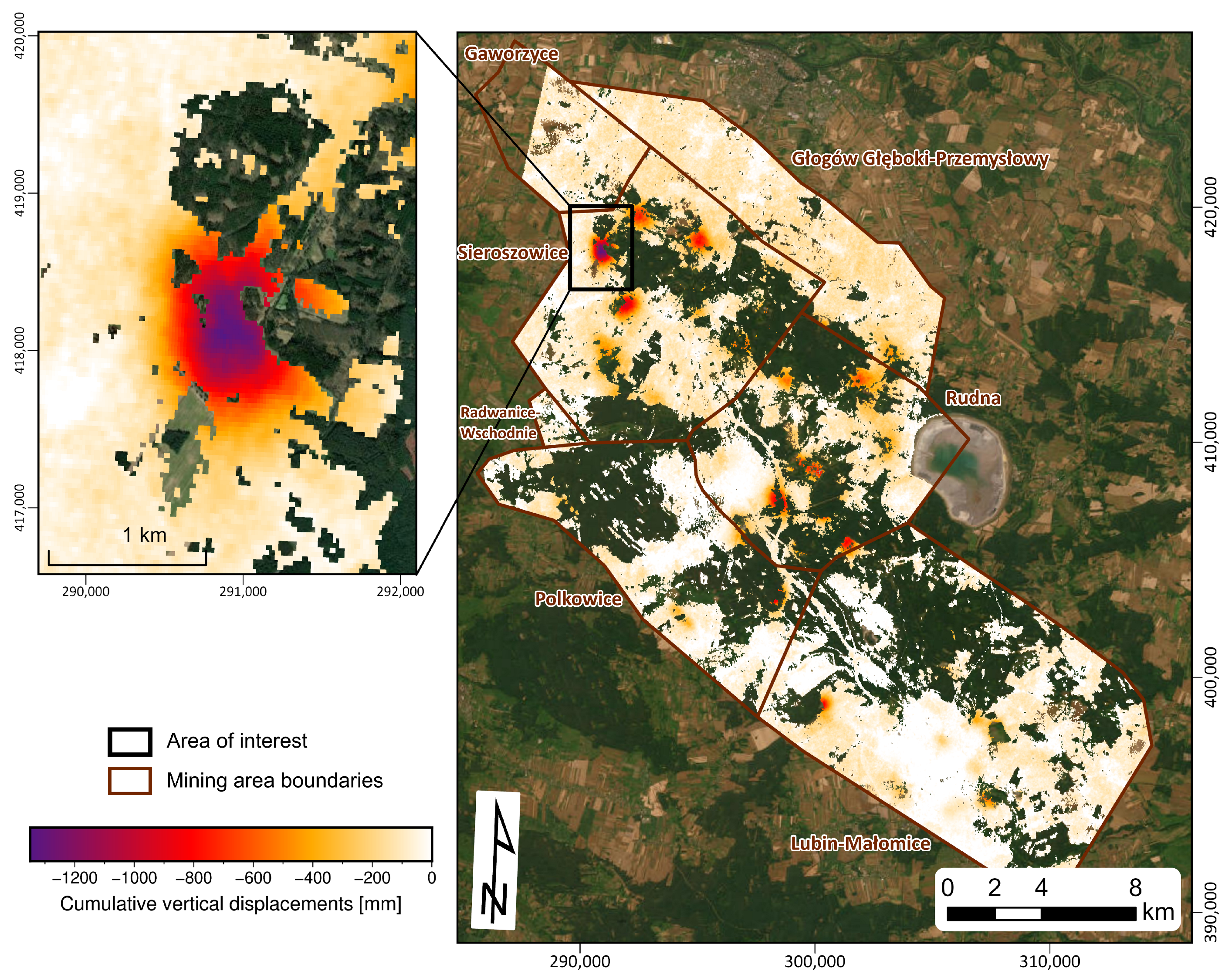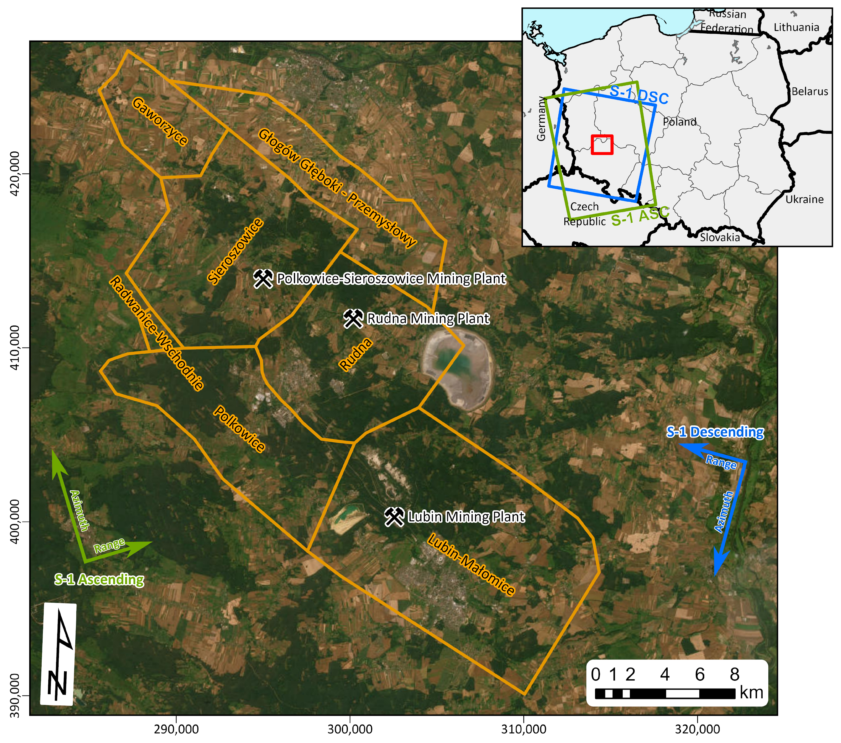 - Antonielli, B.; Sciortino, A.; Scancella, S.; Bozzano, F.; Mazzanti, P. Tracking Deformation Processes at the Legnica Glogow Copper District (Poland) by Satellite InSAR—I: Room and Pillar Mine District. Land 2021, 10, 653. [Google Scholar] [CrossRef]