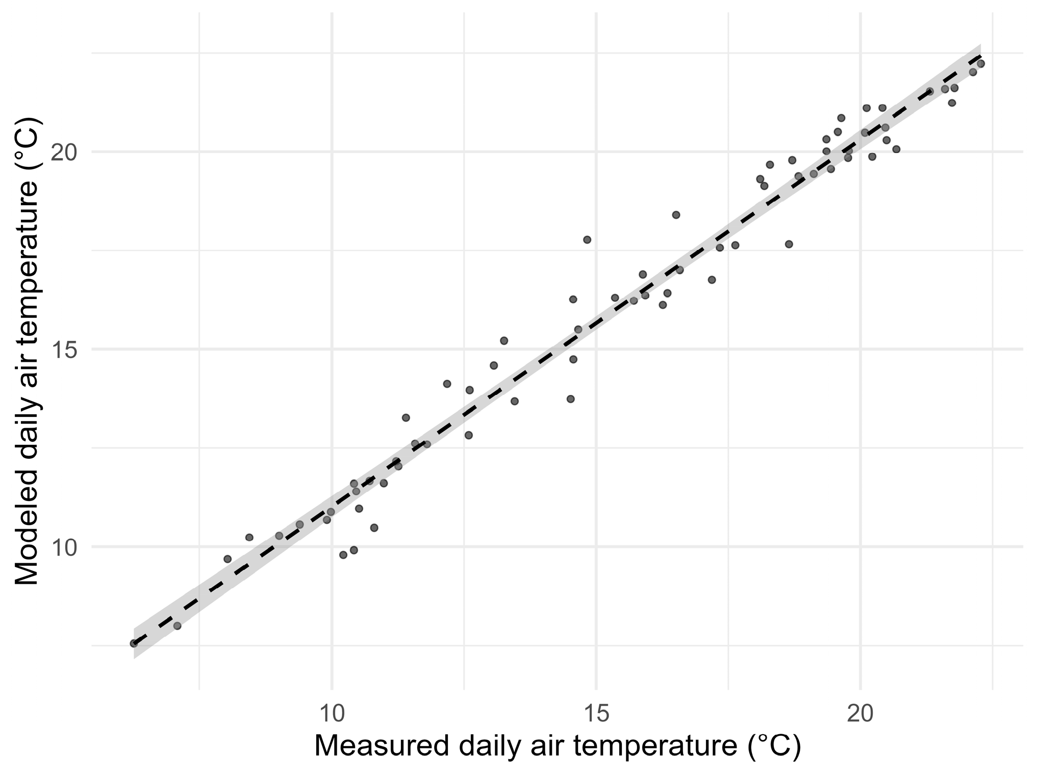Daily mean air temperatures from 5 August to 13 October 2023 recorded by Borith Lake AWS (x-axis) versus modeled daily mean air temperatures (y-axis) at Borith Lake using Passu AWS air temperature and the atmospheric lapse rate. The plot includes the linear regression line (dashed black) and the 95% confidence interval (shaded gray area).