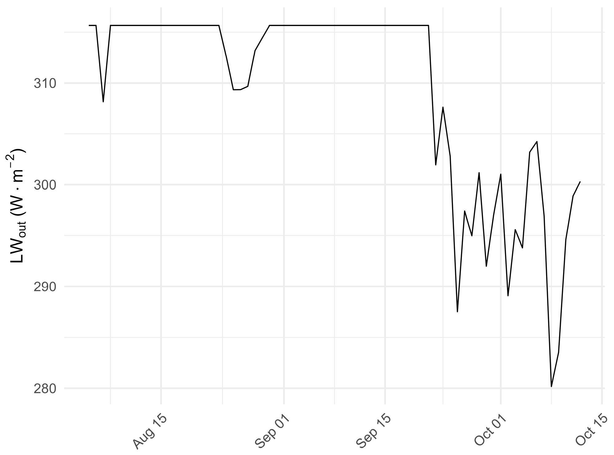 Temporal distribution of outgoing longwave radiation (W m−2) over the Passu Glacier from 5 August to 13 October 2023 (daily values).