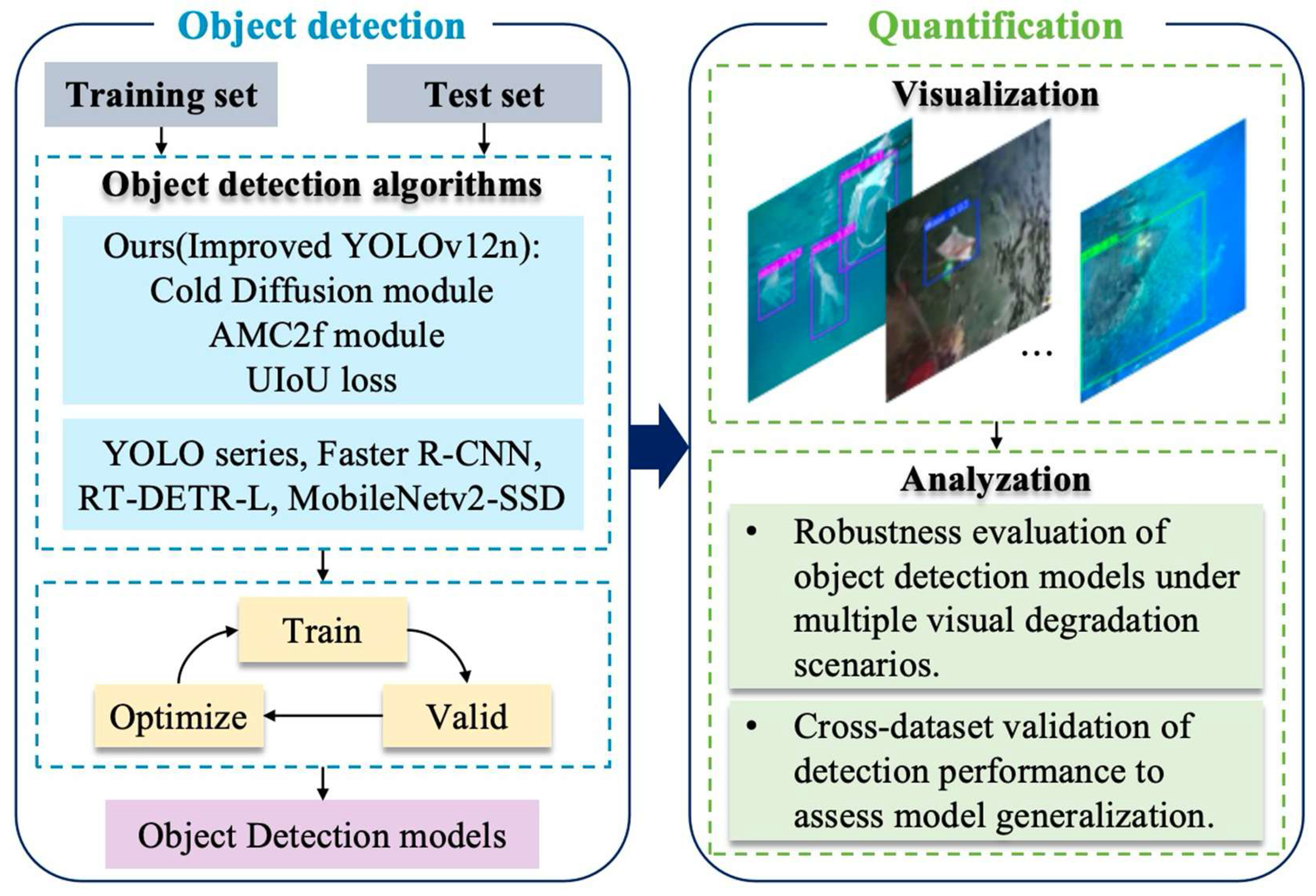 Figure 1 shows the overall framework of this study. A model integrating a Cold Diffusion module, an AMC2f module, and a UIoU loss function was developed. The model was then evaluated against other detectors, including YOLO variants, Faster R-CNN, RT-DETR-L, and MobileNetV2-SSD, as well as under different image enhancement methods. Its robustness was assessed under various degraded visual conditions such as brightness change, Gaussian blur, scattering, and lens distortion. Its transferability was examined through cross-dataset tests to determine whether the model could generalize to new underwater scenes.