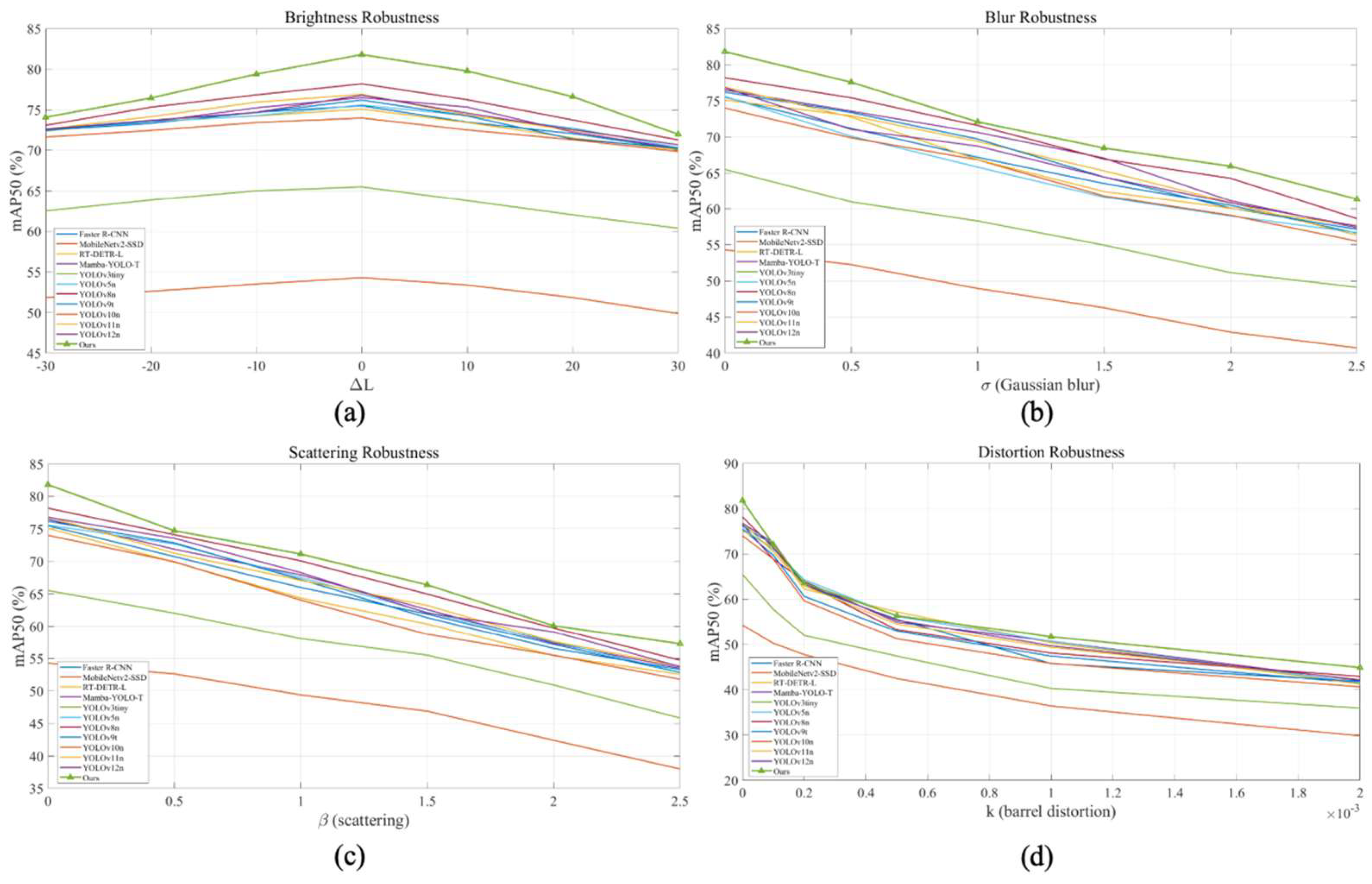 Figure 9b, while detection accuracy of all models declined with increased blur intensity, the proposed model retained superior performance. This suggests that the model’s architecture effectively captures global semantic information, which is less sensitive to local texture degradation [
